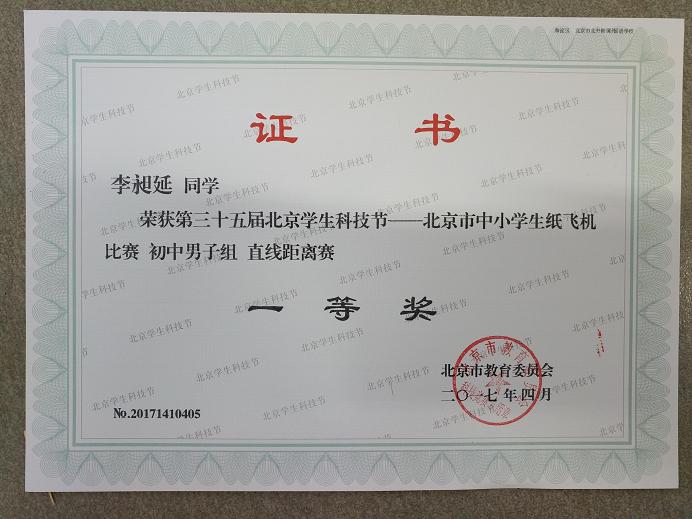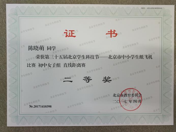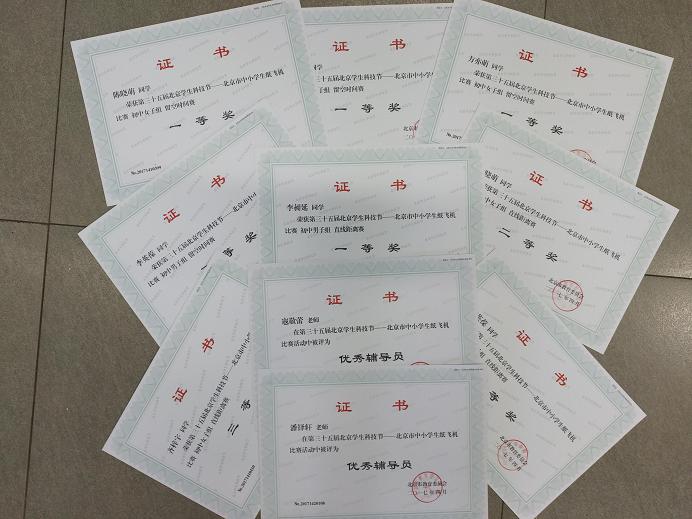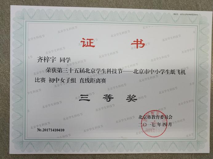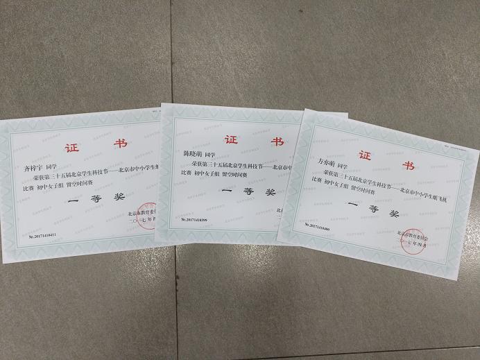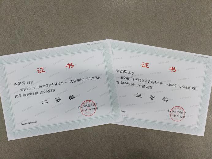 2017年5月,我校初中学生参加了在十九中进行的“放飞梦想、快乐成长 科技体育校园行”纸飞机比赛。初二(3)班方亦萌(4)班陈晓萌、齐梓宇均获初中女子纸飞机留空一等奖。初二(3)班李昶延获初中男子纸飞机直线距离赛一等奖,掷远成绩为30米。