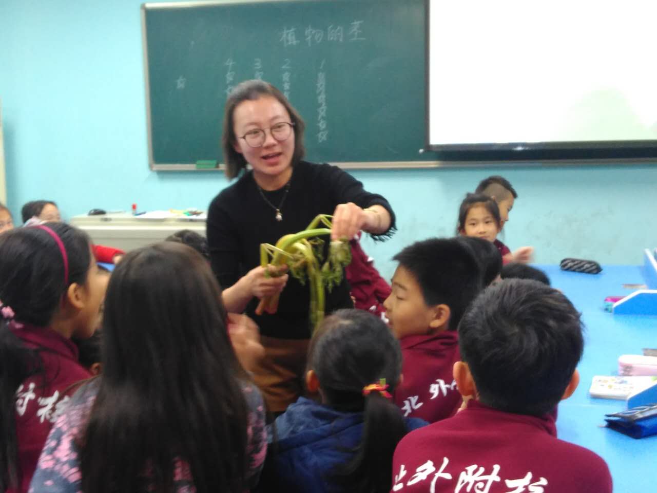 6月5号科学组刘锦老师展示了一节生动的公开课。本节课以学生为主体,创设情境,激发学生探究的欲望,引导学生展开联想,大胆猜测,培养学生动手操作能力和猜想能力。首先引导学生根据前面学习的根和叶的作用,以及对风仙花茎的生长变化的观察,思考有关茎作用的问题。在认识“茎的作用“这一环节中,先提出问题:“茎有什么作用?”——学生猜测——设计实验(主要是芹菜浸泡在红水中的实验。设计后,我让学生预测可能出现的现象)——观察记录,这时我还将“植物的根有吸收水分的作用”实验中的植株(整枝植株已完全变成红色)出示给学生,通过这些信息,学生认识到茎有运输水分和养料的作用。通过这个小实验让学生知道养料是满足植物生长的需要。学生通过实验验证自己的想法是正确的。进行实验验证的主要目的不是帮助学生构建对于茎的作用的完整认识,而是以茎具有运输水分作用的研究为载体,引领学生了解科学探究的过程:提出问题(茎有什么作用);对问题的可能答案做出假设(运输水分和养料);设计实验(运输水分的实验);通过实验收集信息;得出结论。小组实验讨论和探讨给了学生极大的发散性思维空间,学生在活动中真实地感受到科学探究和合作学习的无穷乐趣。