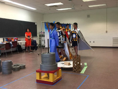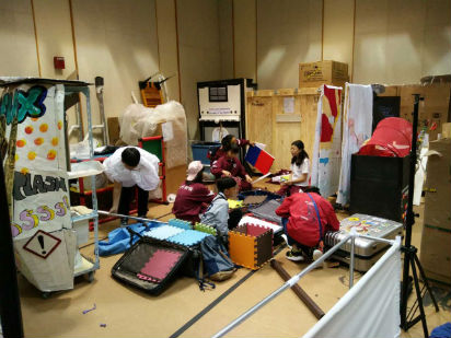 5月26日为我们两支参赛队的比赛日。队员们一大早就起床开始收拾行李进行道具运输与组装。由于全球赛严格的比赛规则,在道具准备阶段不能接受教练提供的任何援助,否则视为违规会被扣分。所以到达预备场地后,队员们全部依靠自己,积极进行道具组装与拼接。经过长期的练习,队员们已经可以快速准确地把道具准备好。到达比赛时间时,队员们已经做好了充分准备,成竹在胸。小学部的长期题是表演类题目,现场的裁判都非常亲切友好,幽默风趣,在这样的氛围中,孩子们都超水平发挥,虽然是用英语进行表达,比赛过程丝毫不受影响,演出过程充满活力与激情,不时引得裁判和观众阵阵大笑和热烈掌声。初中赛题属于套材结构类,需要技术、耐心与现场机智的应变能力的共同结合。最终,在整个团队的共同努力下将自己的实力完美展现。