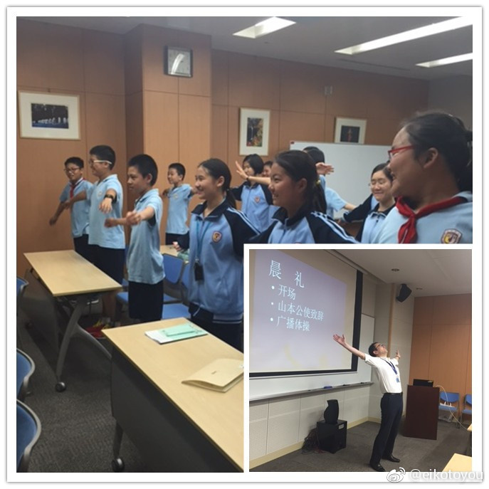 本次研学活动的主题是体验日本中学生活。分为晨礼、社会课、生活课和动漫赏析四个环节。晨礼是日本学生早晨集会的时间,通常是由校长讲话。在晨礼环节中,日本驻华公使山本恭司先生接见了我校师生并发表讲话。他对同学们的到来表示热烈欢迎,鼓励同学们努力学习,成为国际交流的重要人才,为国际交流做出贡献!