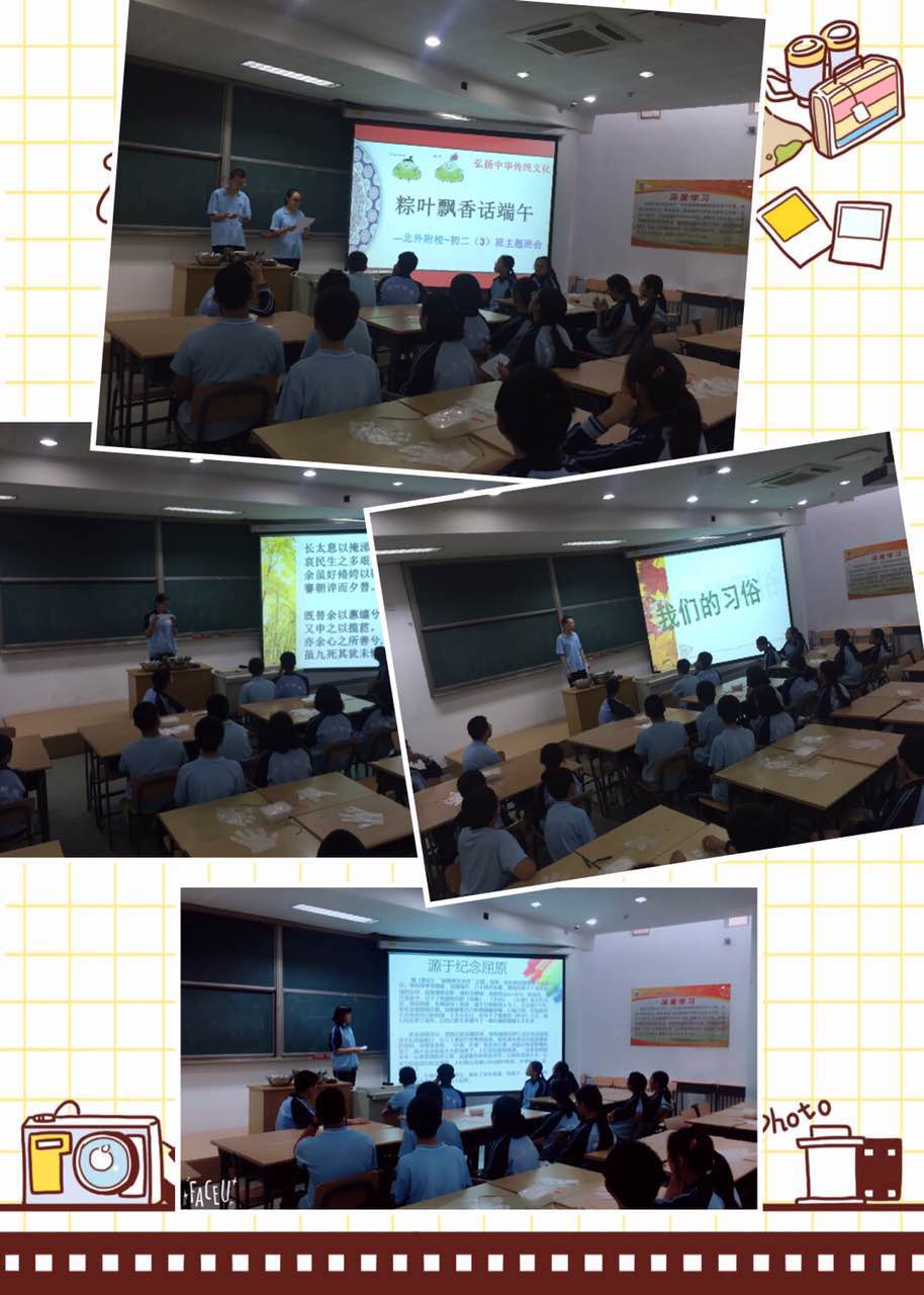 农历五月初五是我国的传统节日——端午节。为大力弘扬和培育以爱国主义为核心的民族精神,传承中华民族优秀传统文化,增强班级温馨感和凝聚力,我校初二(3)班开展了“粽叶飘香,共话端午”主题班会活动。本次班会邀请了学生家长代表一起参与,与学生共度端午佳节。