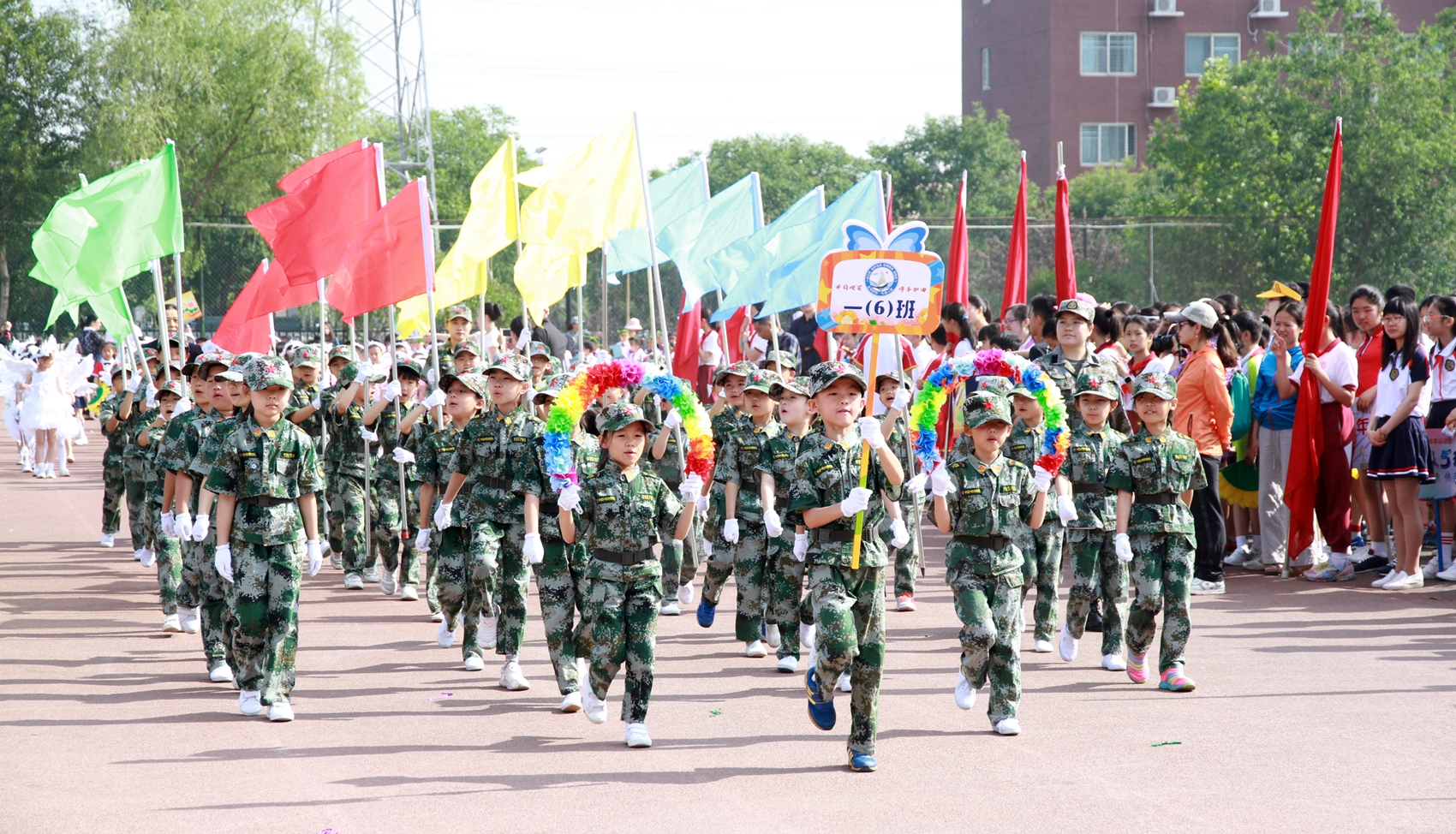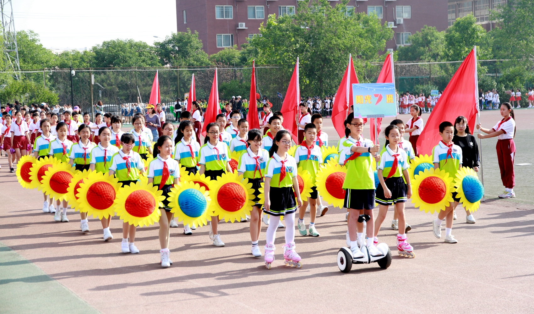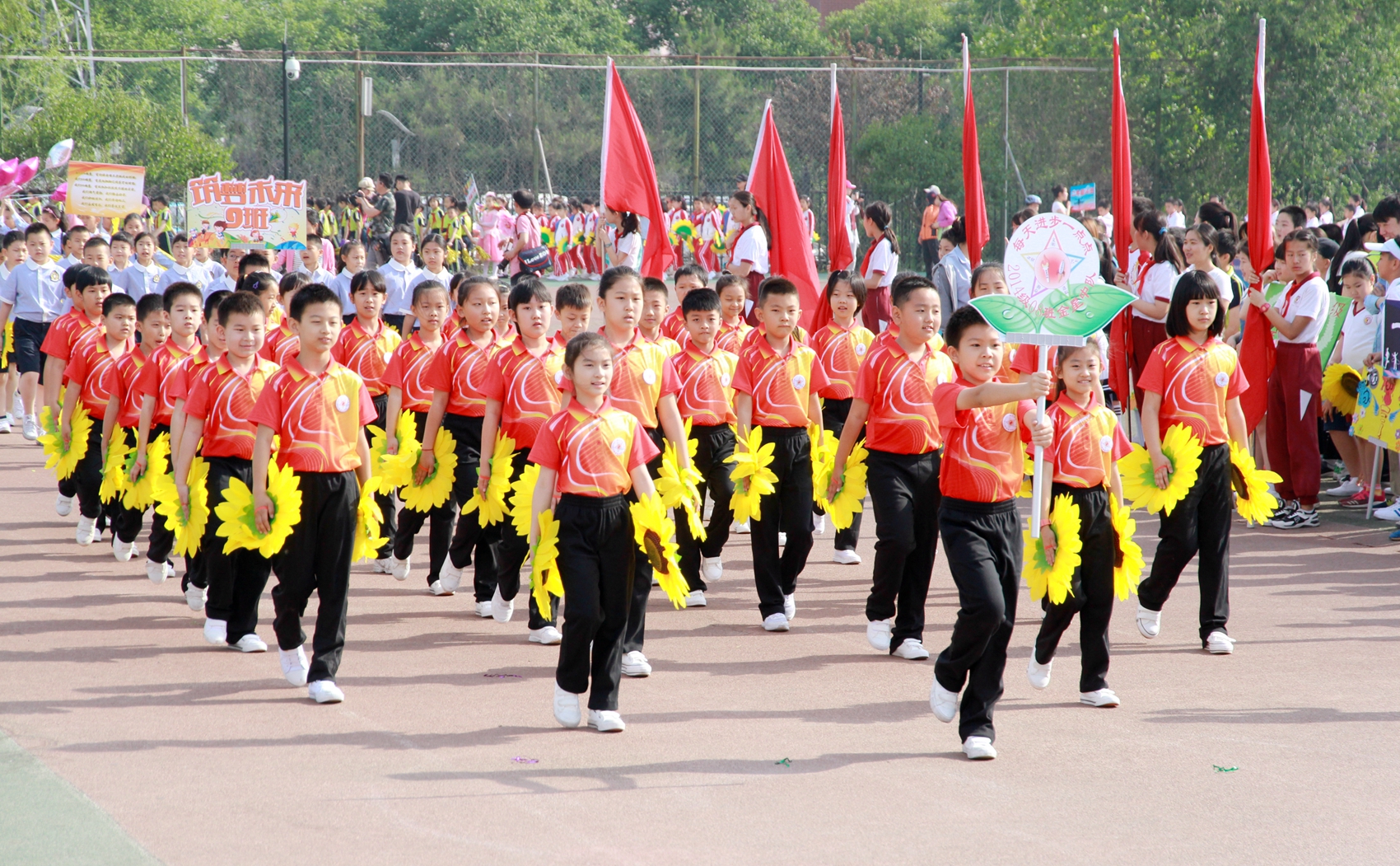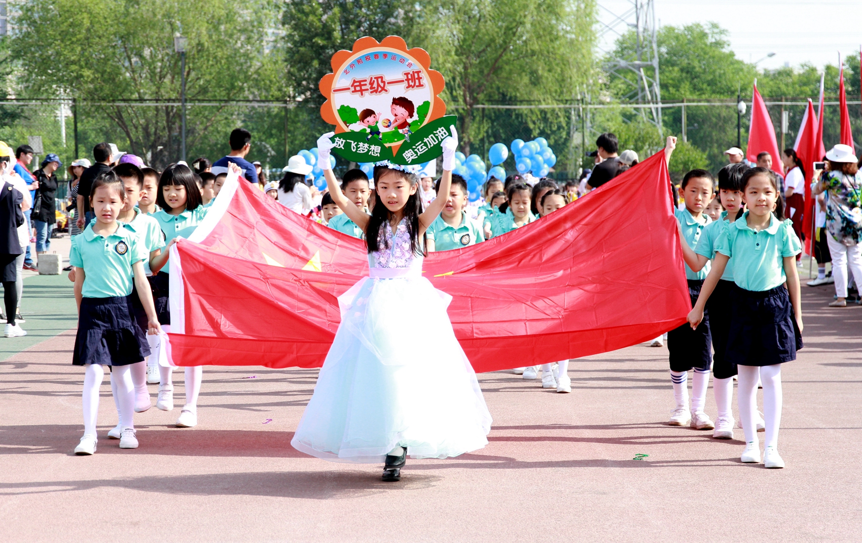 五、六年级的同学们身姿矫健,高举班牌,威严正步,口号足够响亮。三、四年级的入场式或展示各种运动项目,炫酷轮滑、放飞气球、特色表演、独特标语。亮点突出,吸引眼球。预科、一、二年级的小同学,人小气势大,他们面带笑容。虽天真稚嫩却精神抖擞,有模有样。运动员入场式充分展示了我校小学生的朝气与活力,完美拉开了本届运动会的序幕。