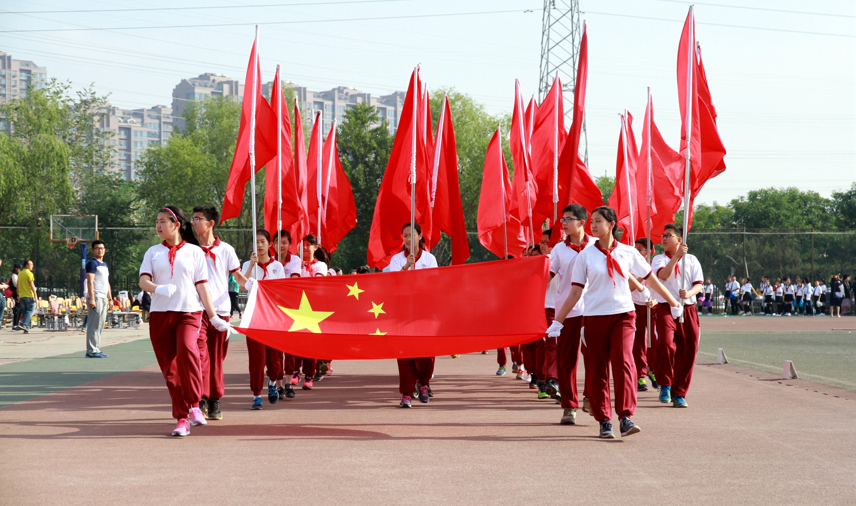 首先映入眼帘的是六十七个班级运动员入场式,班班衣着鲜艳,同学们迈着自信的步伐依次入场。就像花儿准备了春、秋、冬,就是为了红透整个盛夏。蹲下、昂首、出发……轻轻的一抬脚,便牵动了全场的目光。潇洒的挥挥手,便满足了那一份无言的等待。迎着朝阳,你们踏歌而去。