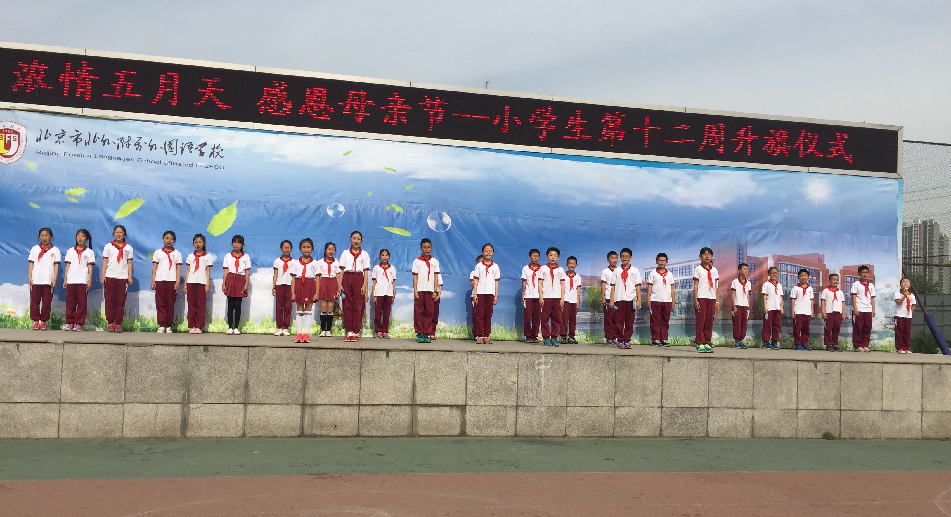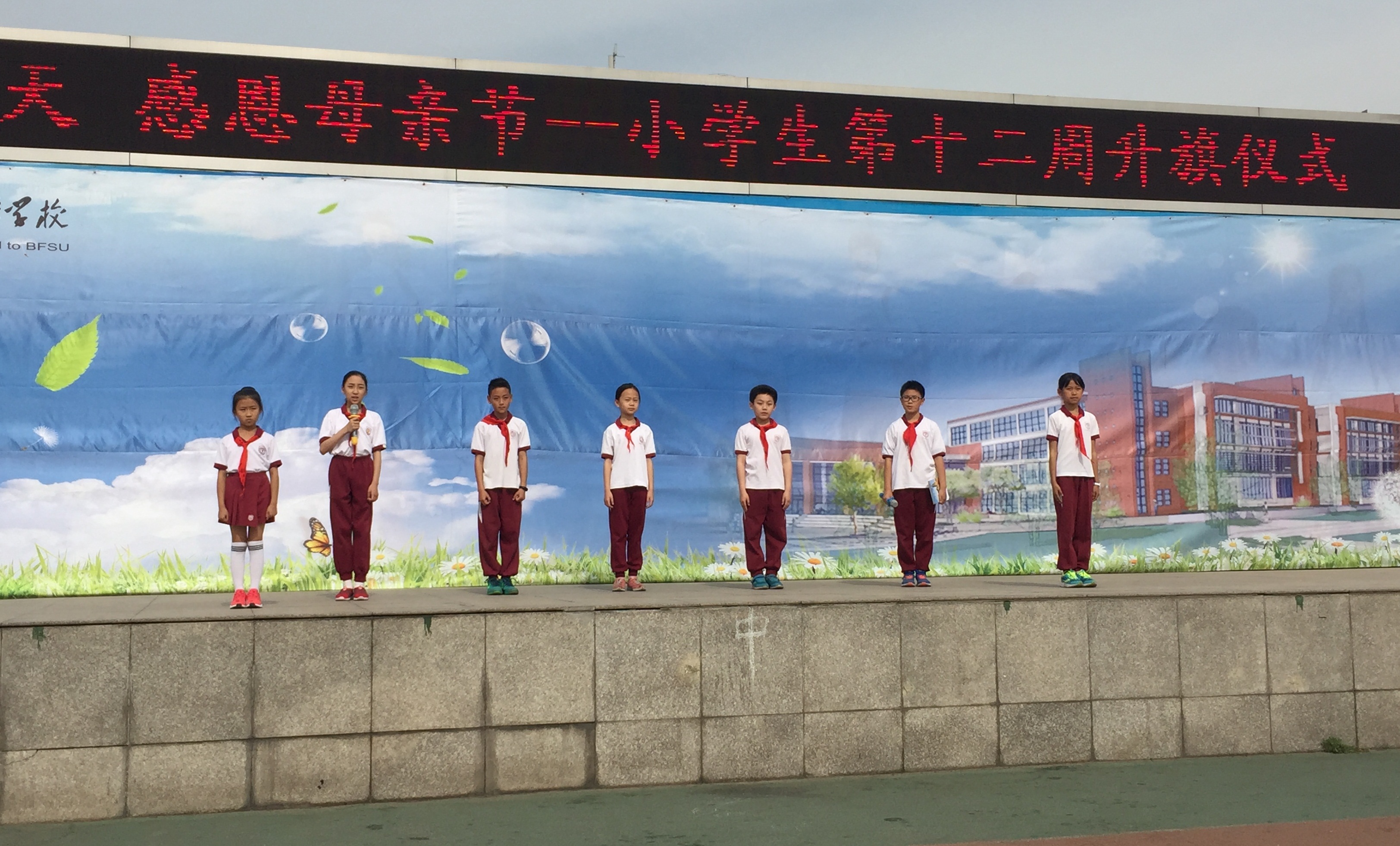 5月8日上午,我校小学校区举行了第十二周升旗仪式,四年级(10)班的同学们进行了以“感恩母亲”为主题的国旗下讲话。北外附校小学校区副校长孟娜、孙亚楠参加了此次升旗仪式。