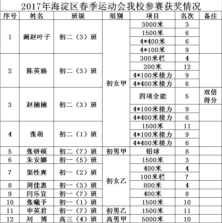 4月21日、22日,我校田径队参加了由海淀区体育局与海淀区教委联合举办的“2017年海淀区中学生春季田径运动会”,并在本次赛会上获得优异成绩,创造了多项历史最佳成绩。