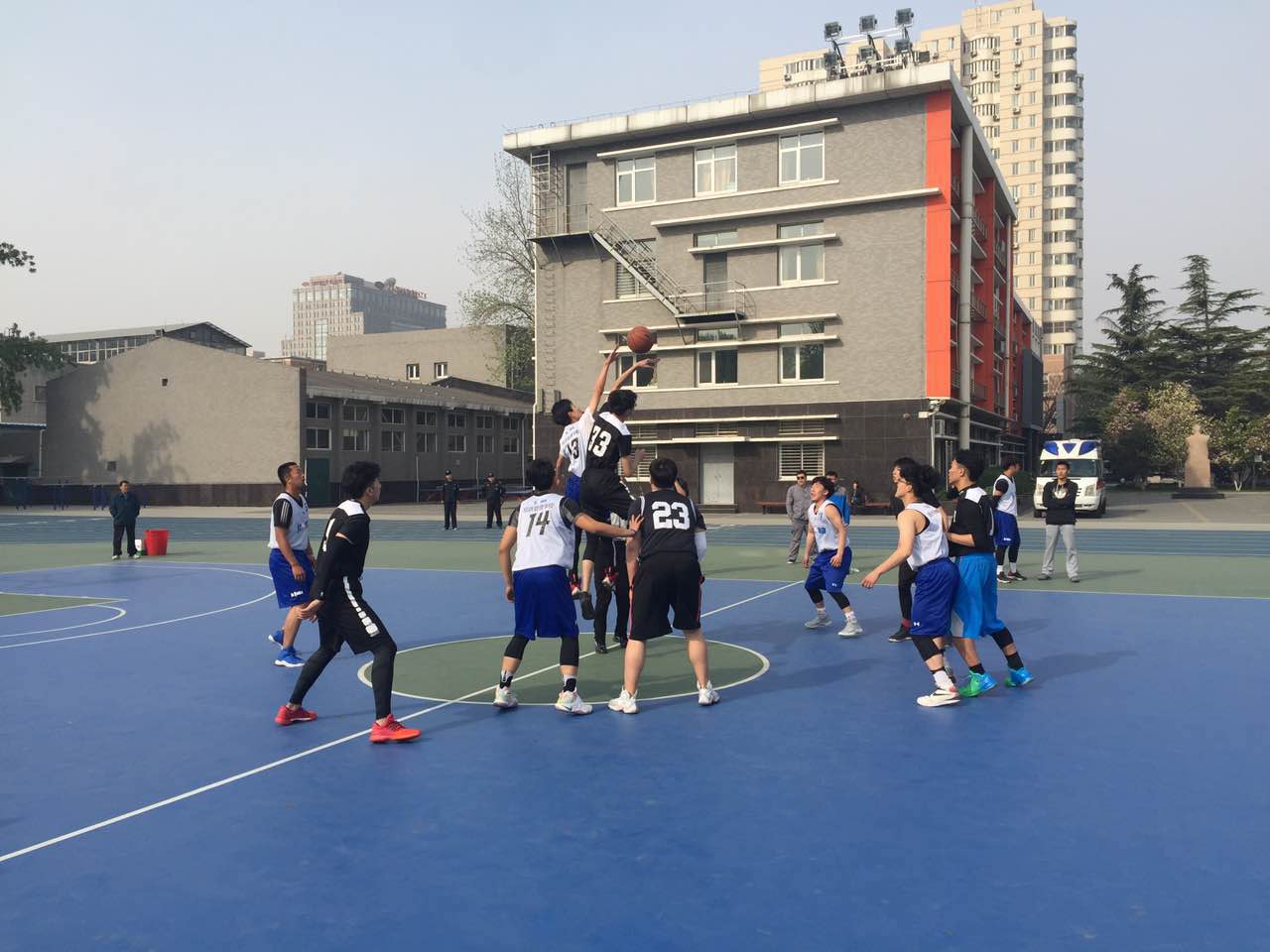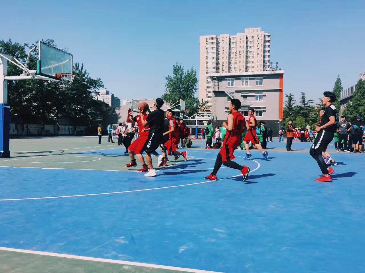 我校高中男子篮球队自4月初参加海淀区中学生篮球赛至今,经过紧张又激烈的角逐,于4月22日以35:27的成绩击败经济管理学校,在此前的小组比赛中,分别击败了科大附中、理工附中与十九中,获得了四战全胜,并以小组第一的优异成绩出线。参赛队员分别为:高三年级谢金刚;高二年级张宇田、杨帅、孙伟康、郁明玚、李泽腾、李嘉辰;高一年级袁鹏程。