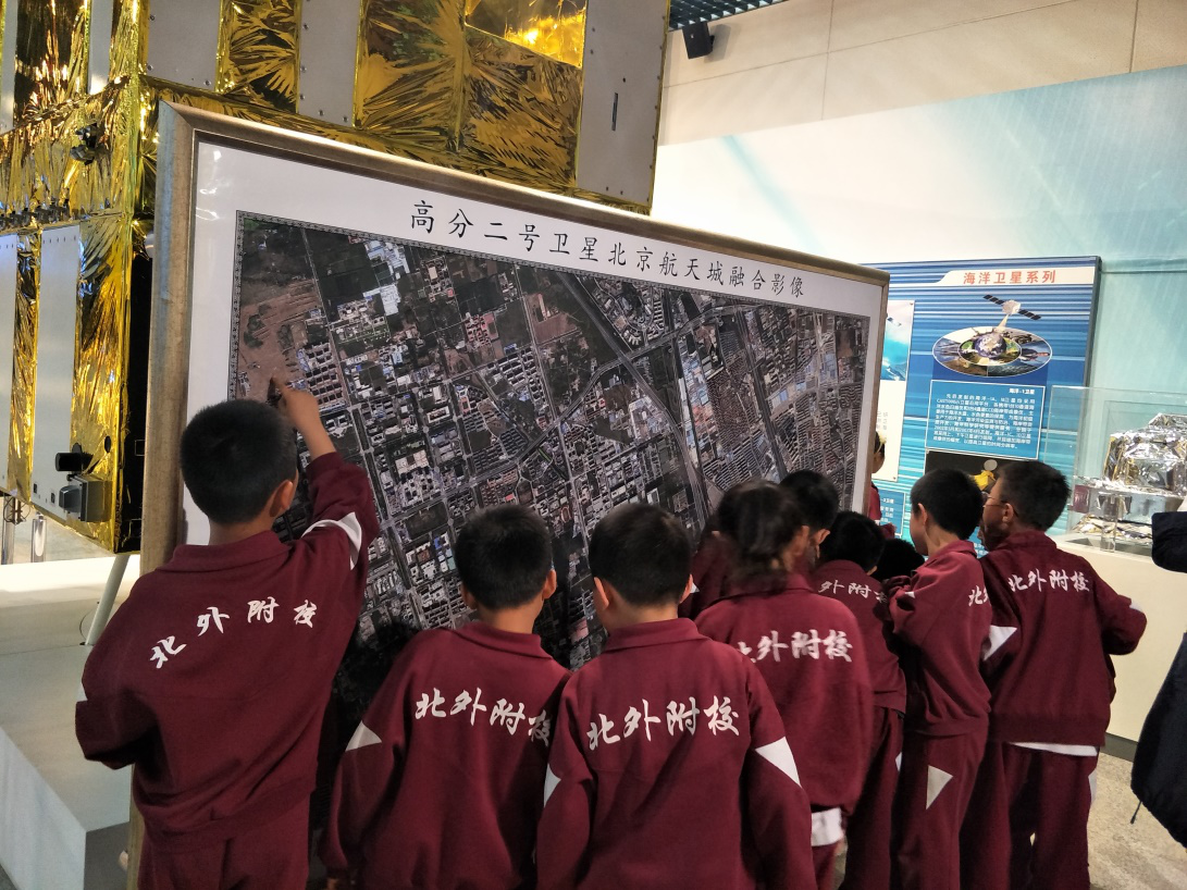在我们现实生活中,卫星还为我们提供了很多帮助。卫星上面会有照相机,它会拍摄到地面的情况,每个街道,每个建筑物,都会拍摄的非常清楚。得知这个信息,同学们在高分二号卫星拍摄的影像前,开始兴奋地找我们的学校,找自己的家。