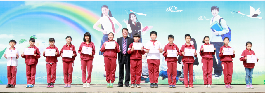 升旗仪式上,学校还对参加第38届世界头脑奥林匹克中国区决赛、北京市体育传统项目学校比赛、海淀区中小学生“世纪杯”计算机比赛的获奖同学进行了表彰,林校长、孟校长、孙校长为获奖学生颁奖并合影留念。