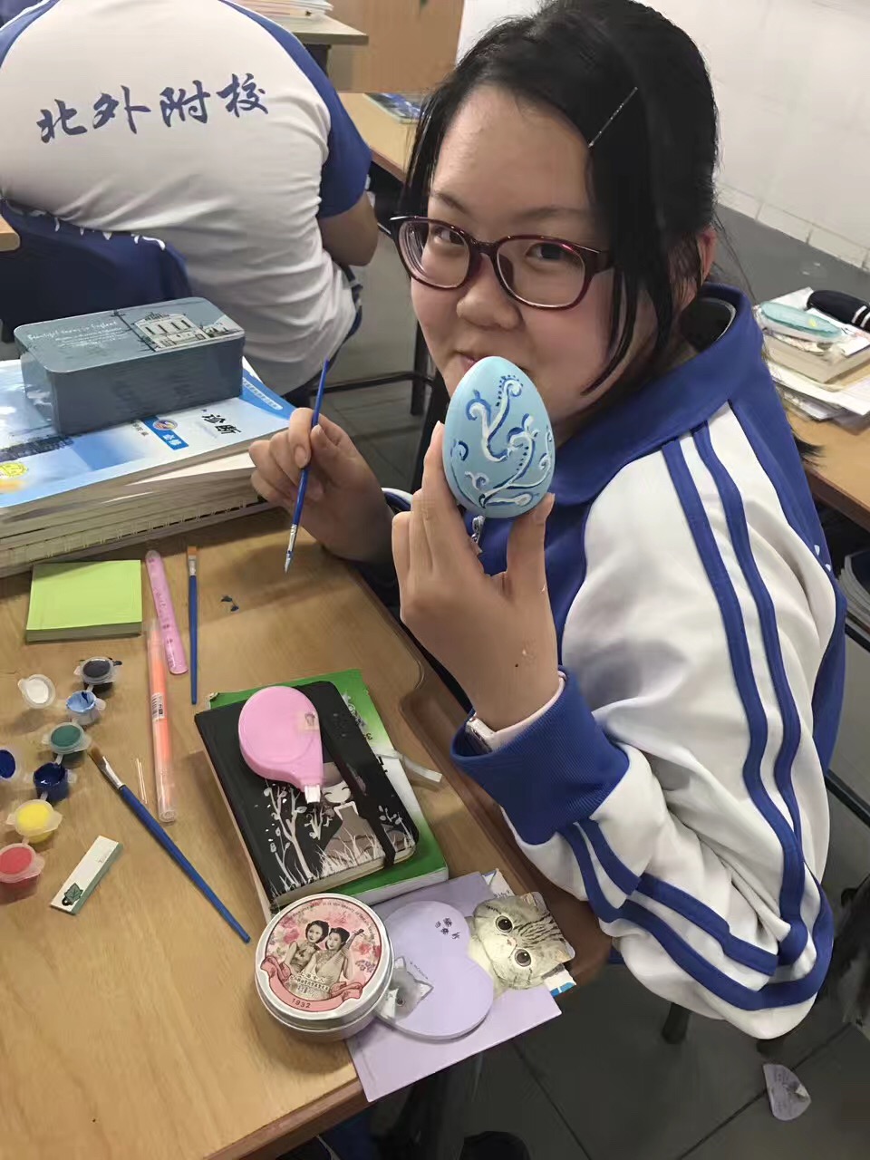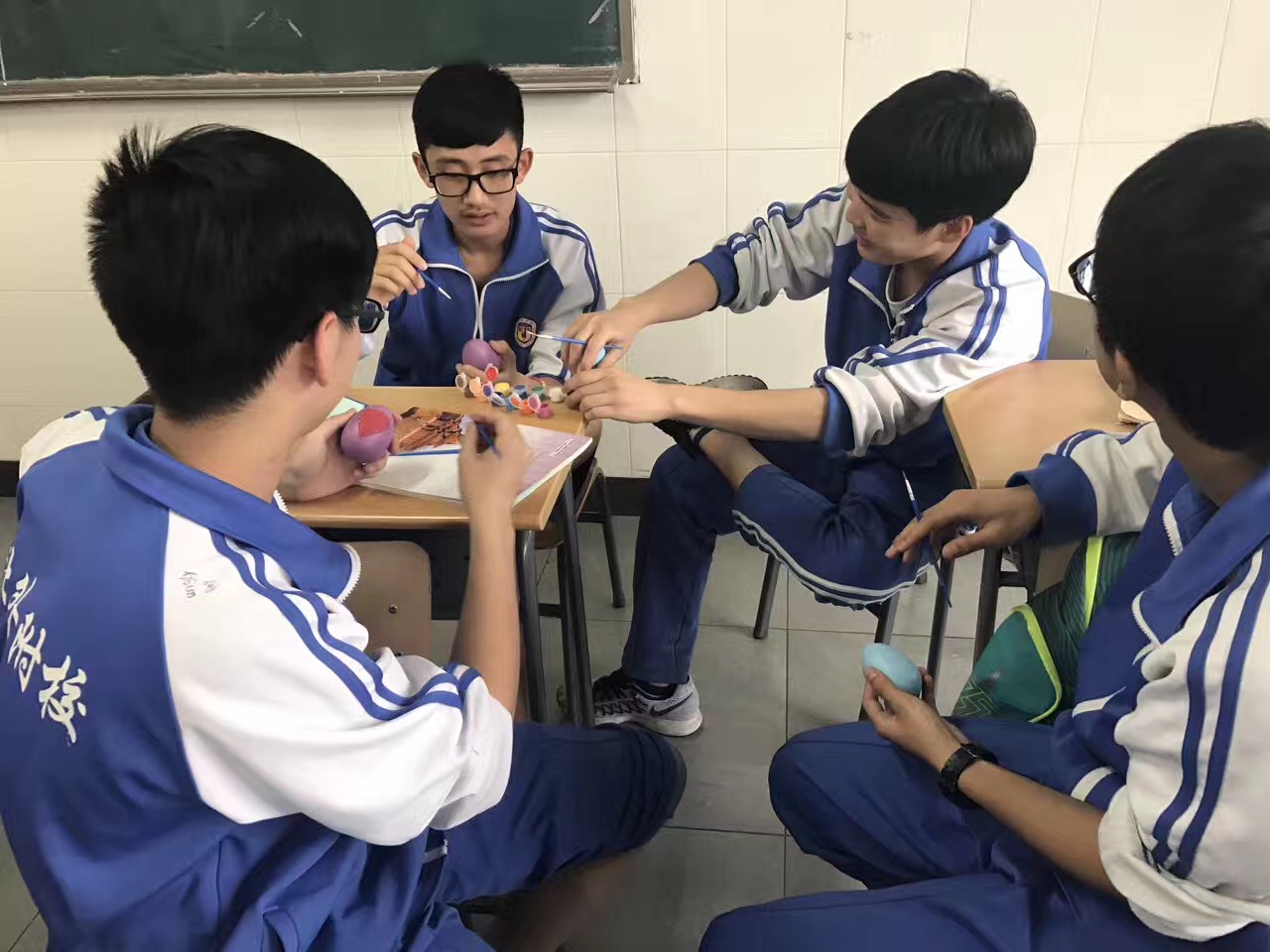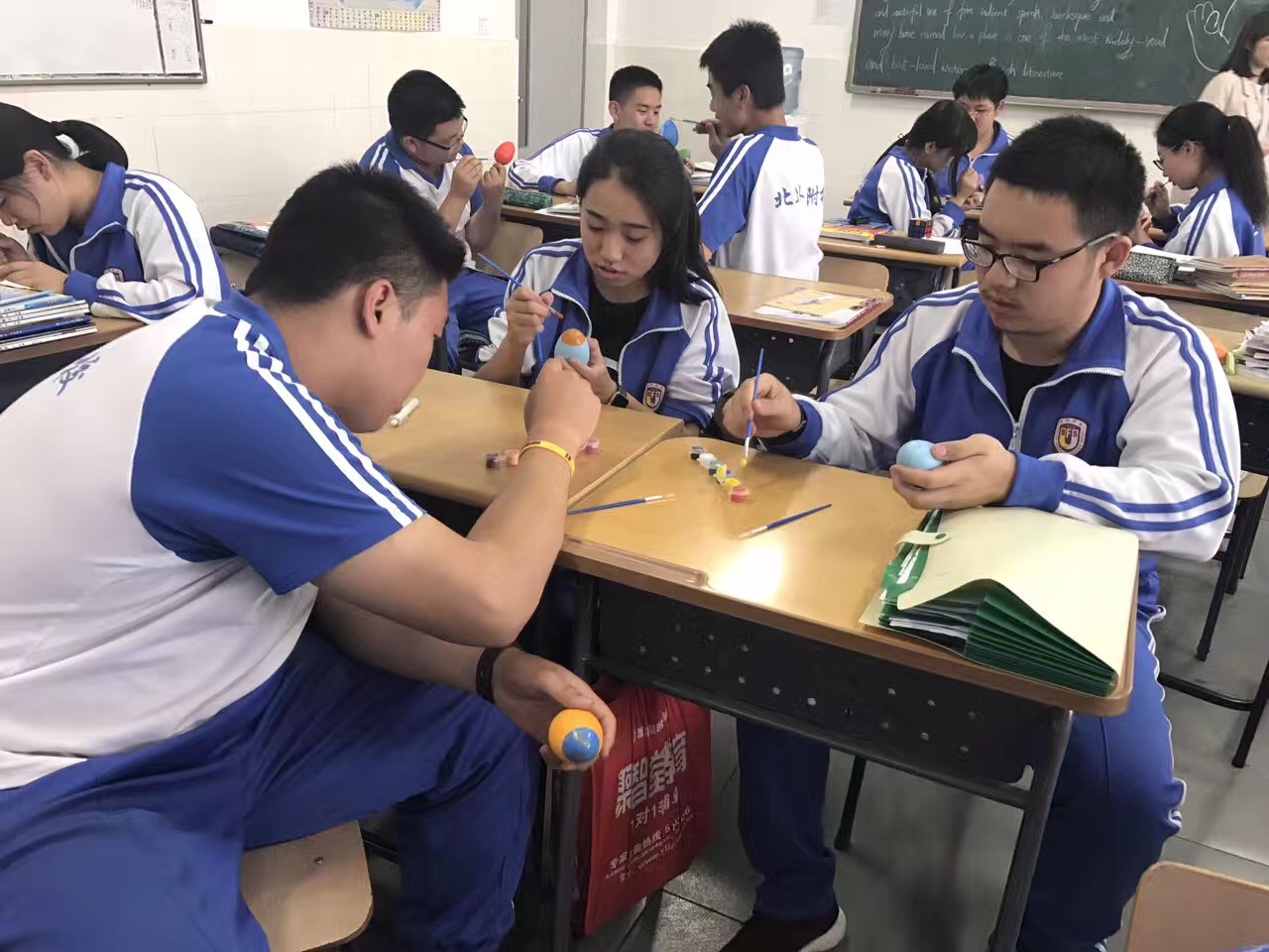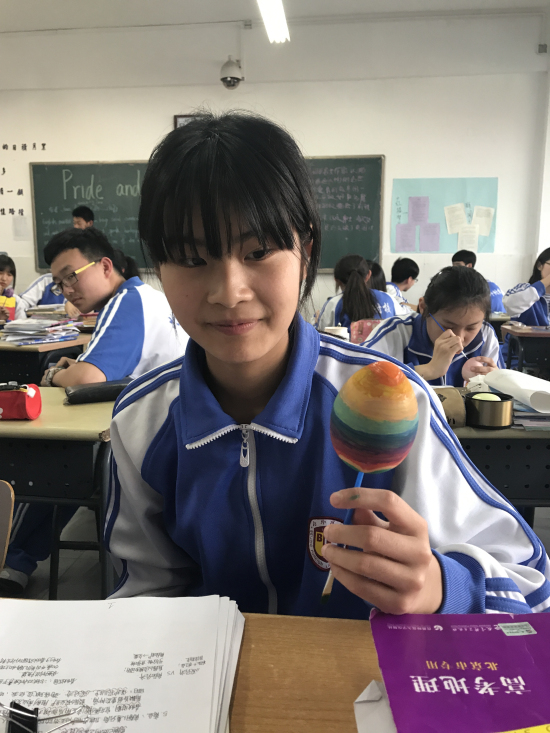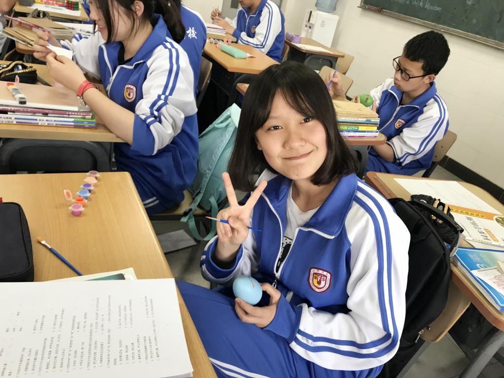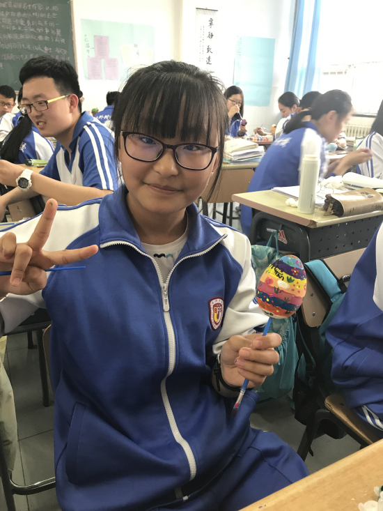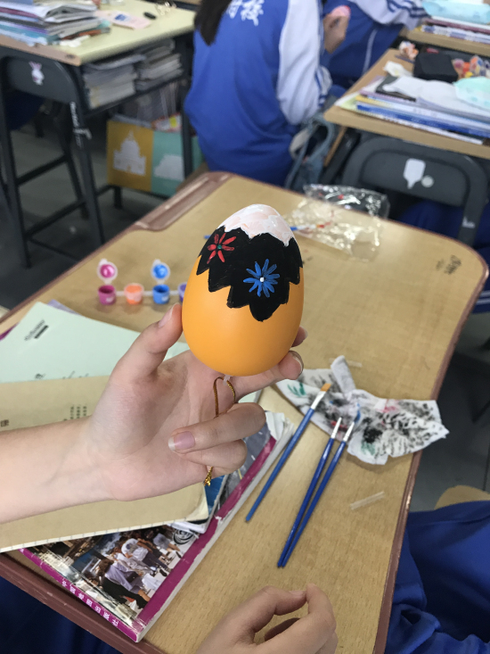 之后,为了让学生更真切地体验西方文化,老师们特意准备了彩蛋和绘画工具,让学生在教室自己设计并绘制彩蛋。鸡蛋在西方是新的生命和兴旺发达的象征。鸡蛋的本色象征太阳,把鸡蛋染成红色则象征生活幸福。在复活节中,父母要特地为孩子们准备制成鸡蛋形状的巧克力糖。亲友间要互赠彩蛋。在绘画过程中,同学们发挥了他们的想象力和创造力,作品中不乏有特色的佳作,令大家赞叹不已。