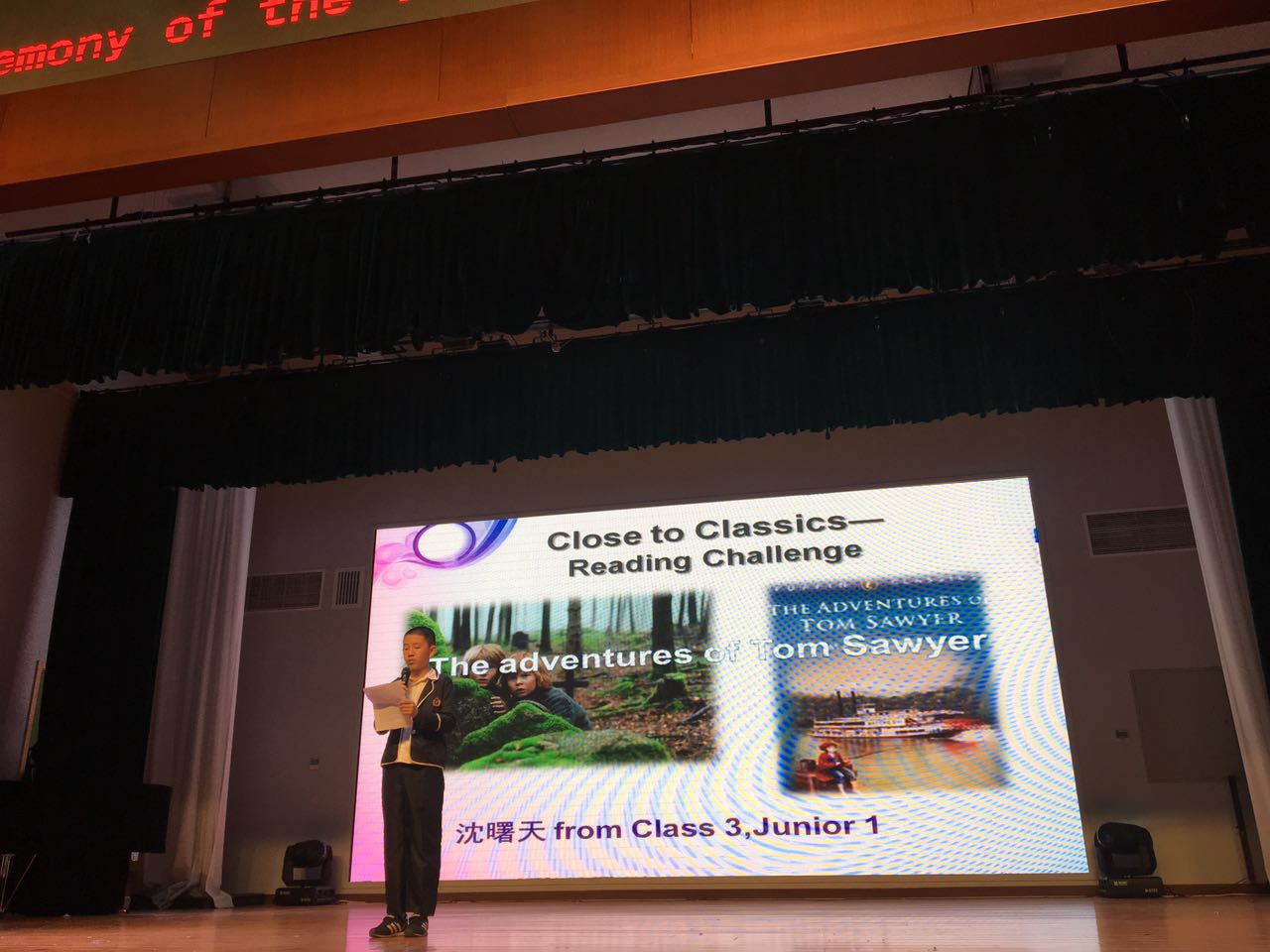 随后本届外语节各竞赛活动的部分获奖者进行了风采展示。初一朗诵比赛的一等奖展示的是《汤姆索亚历险记》和《格列佛游记》。两位朗读者用标准的发音、流畅的语速和惟妙惟肖的语调完美再现了书中的精彩片段。初二则是由三位讲述者跟大家分享了他们阅读《弗兰肯斯坦》的体会。他们的演讲不仅包含对内容的介绍,还对作品进行了深度的剖析,引发阅读后的思考