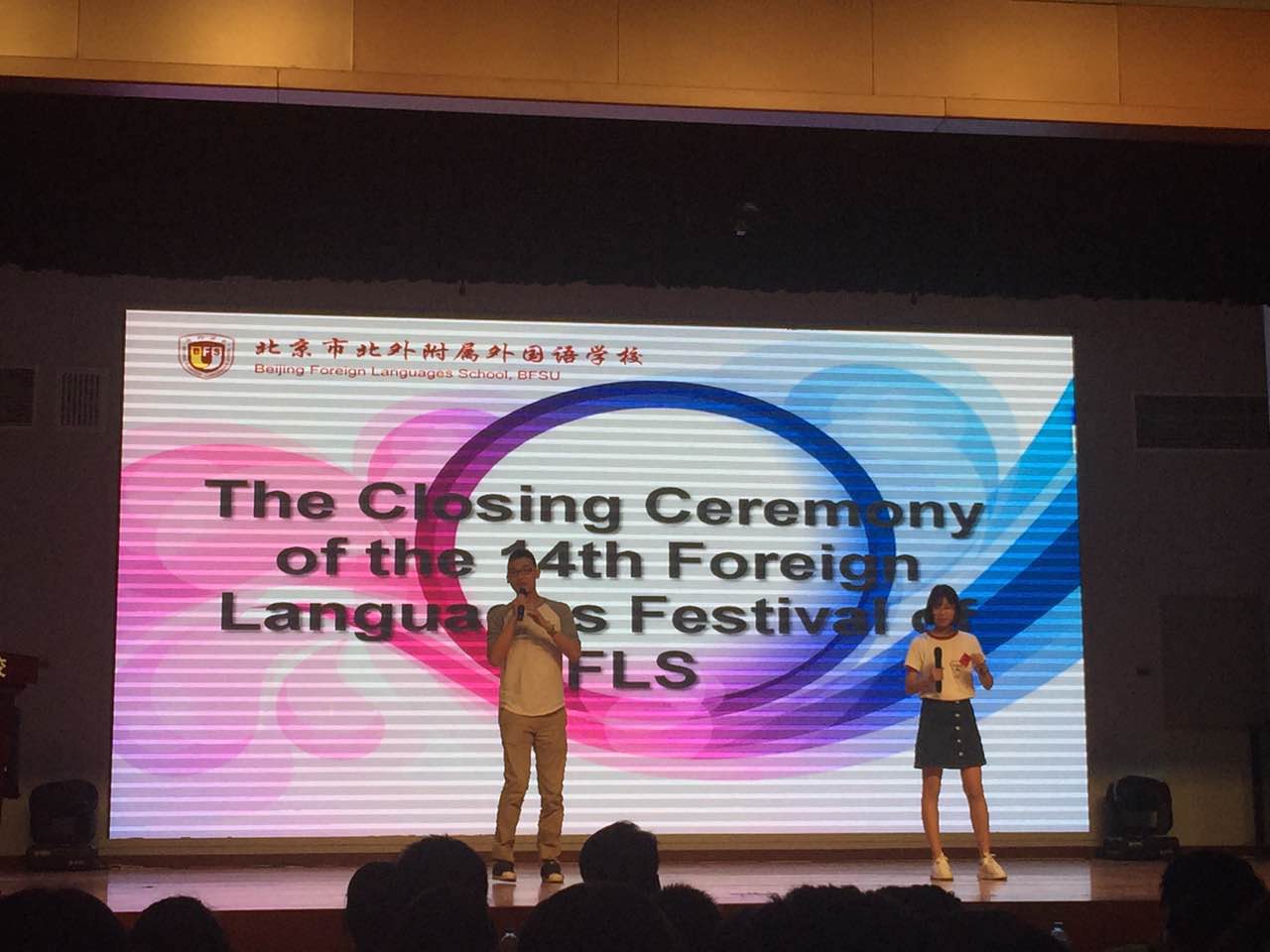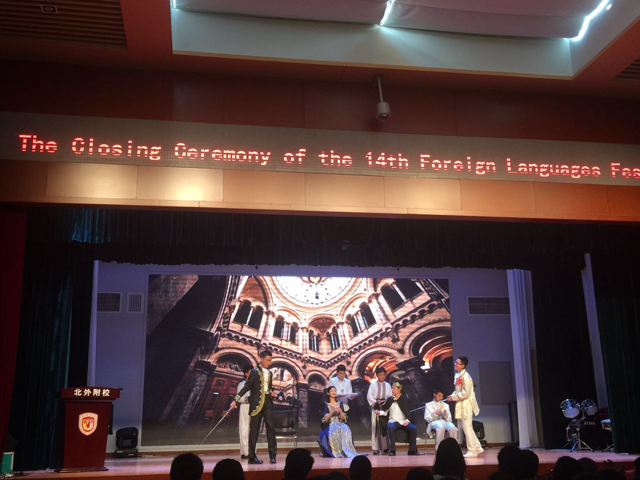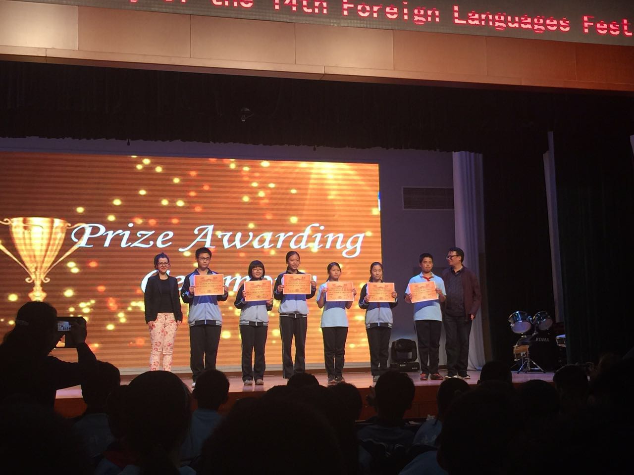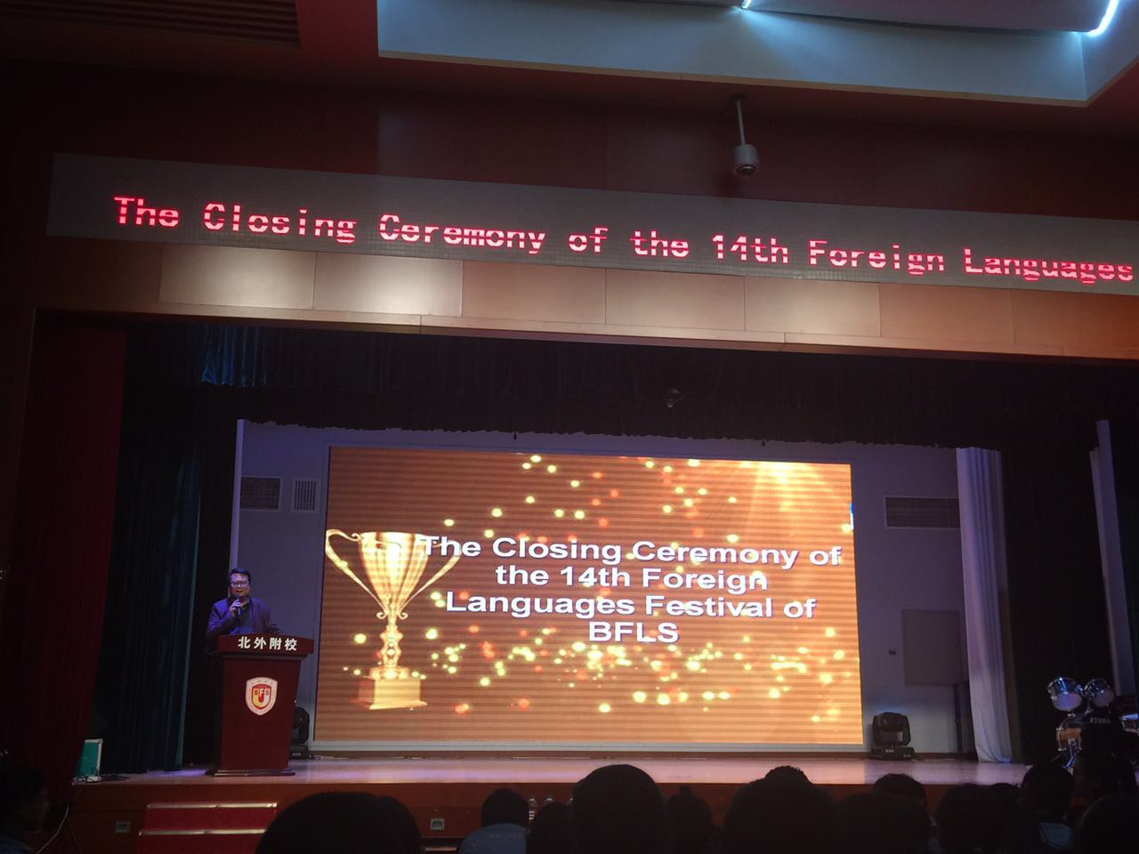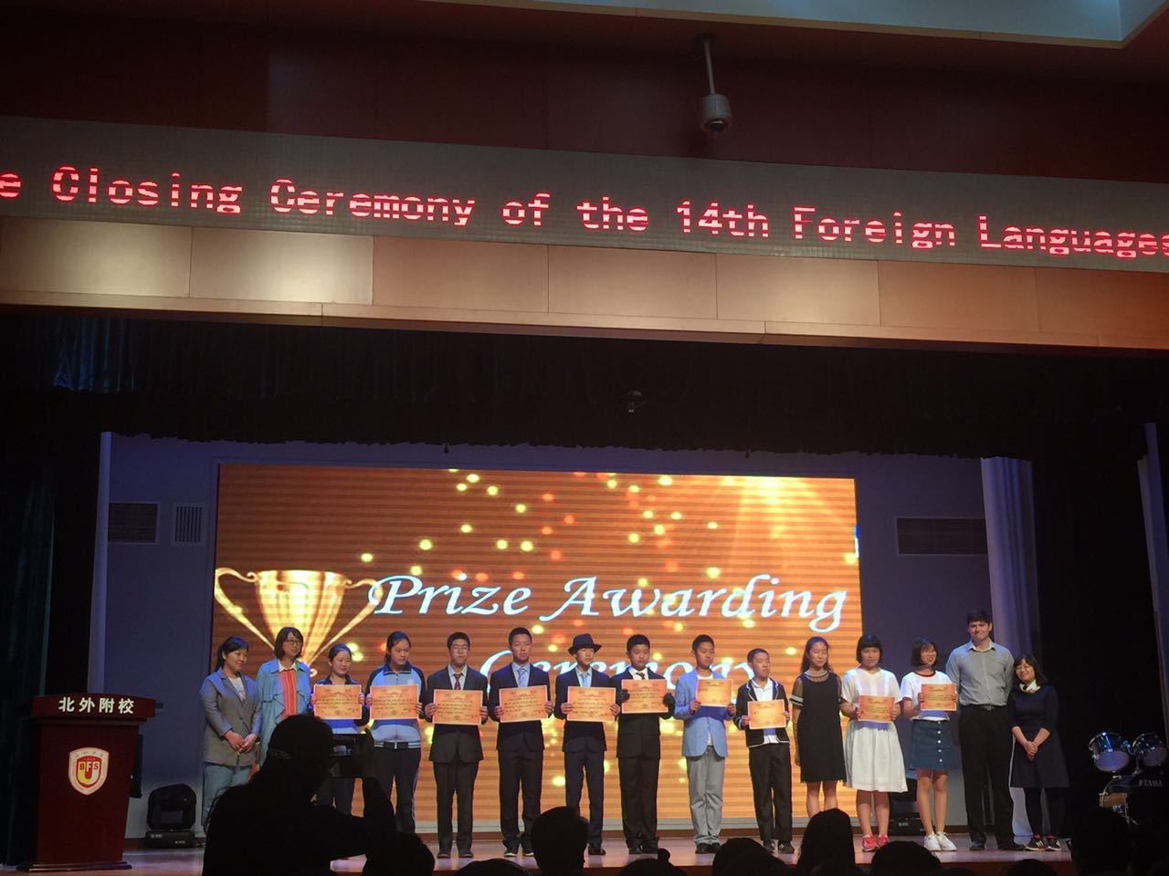 2017年4月18日中午,我校初中校区在国瑞厅举行了北外附校第十四届外语节初中戏剧展演暨颁奖典礼。北外附校校长林卫民,副校长张继军,校长助理杨磊,许祥,我校多位外教及初一初二全体师生参加了本次外语节闭幕活动。