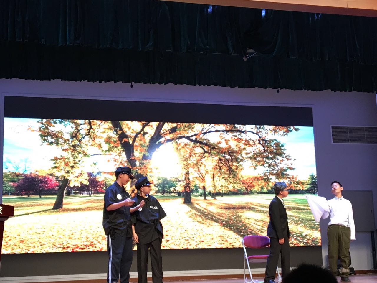 初一的同学们将美国作家欧亨利的著名小说《警察与赞美诗》改编成了舞台剧, 不仅生动再现了小说的经典情节还带有充足的趣味性。戏剧的前半部分引起笑声连连,而结局则发人深省,令在场的同学为之动容。