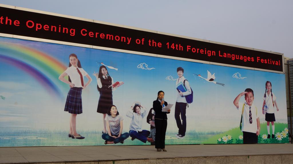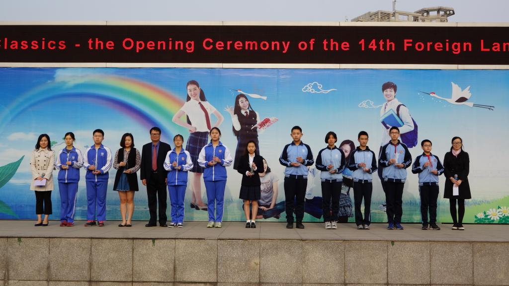 为了给学生提供展示个性风采的平台,营造学习外语的良好氛围,激发全校学生学习外语的兴趣,丰富校园文化活动, 2017年4月10日早7点半,北外附校第十四届外语节开幕式在操场主席台前隆重举行。北外附校校长林卫民,副校长高雁鸣,张继军,校长助理王静,杨磊及初高中全体师生参加了本次开幕式。