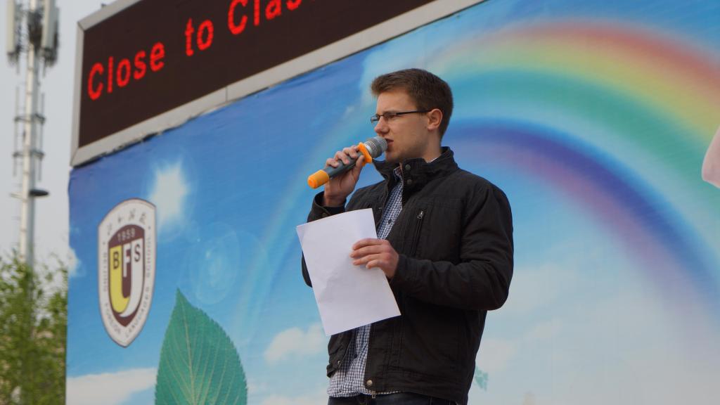 之后,张校长还邀请了我校德语外教Dustin Baron跟同学们分享他对经典阅读的领悟。Dustin通过自己的阅读经历向同学们讲述了阅读经典的点滴收获,例如能助力外语学习,扩大词汇量,学习地道的表达方式;还可以通过经典阅读了解各国历史、文化、增强国际视野;另外,对小说中的人物的理解也可以帮助我们学会辩证思考、学会为人处事。对于如何阅读,Dustin也给予了同学们许多实用的建议,包括:不要轻言放弃,要早点开始,以及要及时停下来思考,没有读懂的地方要反复阅读,并询问老师、朋友或网络,最后一点是交流,正如我们在这次外语节中所作的,跟同学们一起读一本书,通过彼此交流获得更好的理解。