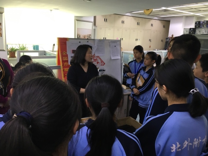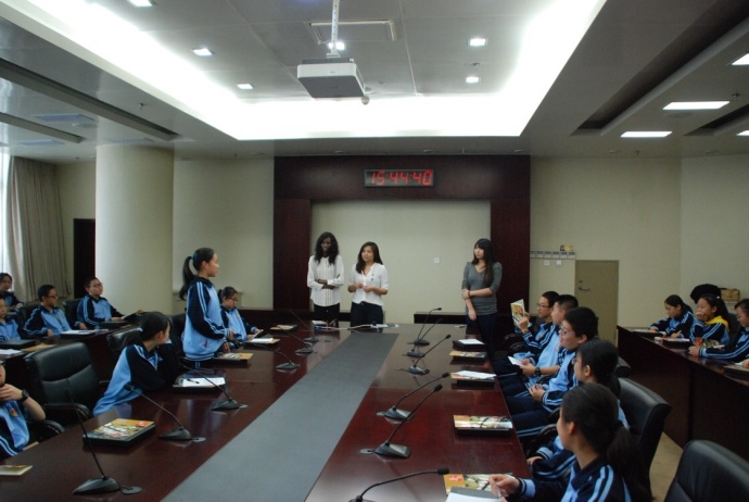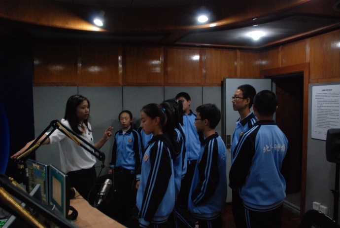 在参观法语部办公室、法语节目直播间后,法语部副主任杨晓岚对法语部的成立、人员组成和电台工作方式进行了细致说明,并为师生赠送带有国际电台标志的礼品。业内享有很高知名度的电台首席法语主播熊伟老师也对法语班学生提出了殷切的希望,希望中学生也能担负起传播文化的社会责任,努力学习语言加强与世界的联系,这一切也符合了国际电台的宗旨,即“向世界介绍中国,向中国介绍世界,向世界报道世界,增进中国人民与世界人民之间的了解和友谊”。参观结束后,赵芳薇和外国专家Mado女士与学生一起进行座谈交流,交流期间解答了学生普遍对单一媒体的疑问,向大家介绍了综合性媒体的现代化趋势。