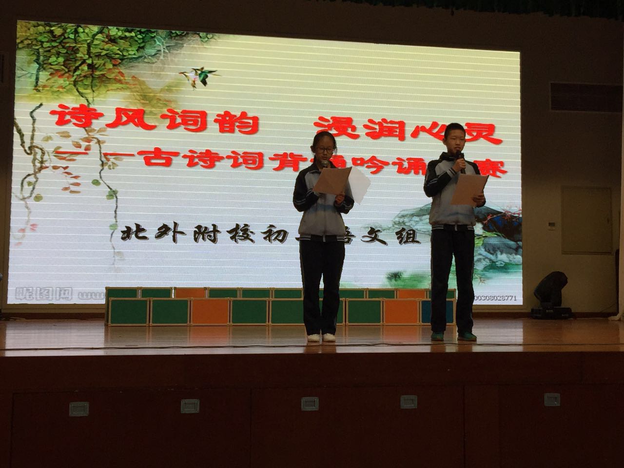 古诗词是中华民族的精髓,也是世界文化宝库中的一颗璀璨的明珠。为了更好地推动与传承悠久灿烂文化,激发学生对古诗词的兴趣,展现学生的个性风采和精神面貌,我校初二年级于2017年3月27日下午第九节课,在国瑞厅开展了第三届古诗词背诵吟诵比赛活动。