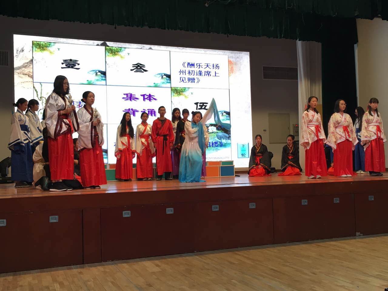 下午4点40分,活动在全体同学齐唱《声律启蒙·一冬》的旋律中正式拉开帷幕。本次活动除了沿用以往的班级集体背诵环节外,还增加了班级吟诵环节,创新了飞花令环节,深受学生们喜爱。班级吟诵的篇目有:《望岳》《渔家傲》《无题》《破阵子》《蒹葭》《鹿鸣》《关雎》《宣州谢朓楼饯别校书叔云》《关雎》。在吟诵中同学们根据自己对诗歌的理解和感悟,或慷慨激昂,或舒缓婉转,富有情感的吟诵让大家深深陶醉,也道出了学生对生活的热爱与赞美。班级间的飞花令对抗赛更是将此次活动推向了高潮,每班推荐四名实力选手,接着让班主任现场通过大屏幕随机抽取四人组成班级8人参赛队,仅此环节就已让台下同学兴奋激动不已。接着每班参赛队要按规则说出带有“春”“花”“秋”“月”的诗句,每答出一句记上一分,两个班对阵,比赛现场十分激烈,台上选手们的精彩表现,不时赢得台下观众们的阵阵掌声。活动最后,主持人宣布了本次比赛结果,整个活动在全体同学的《陋室铭》的吟诵声中结束了。