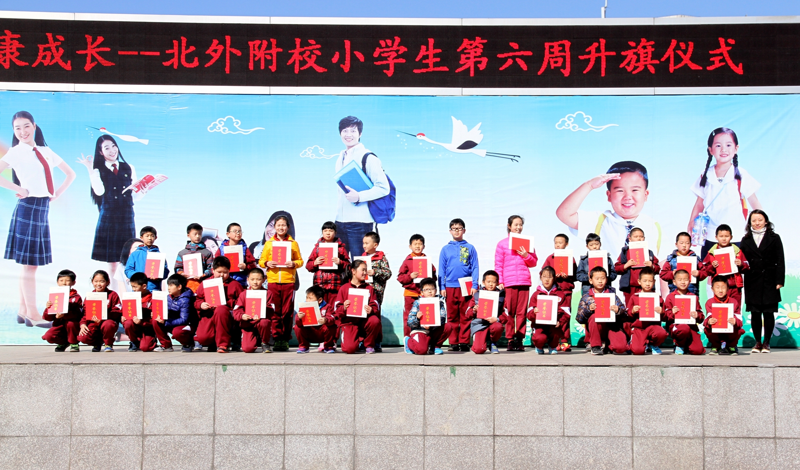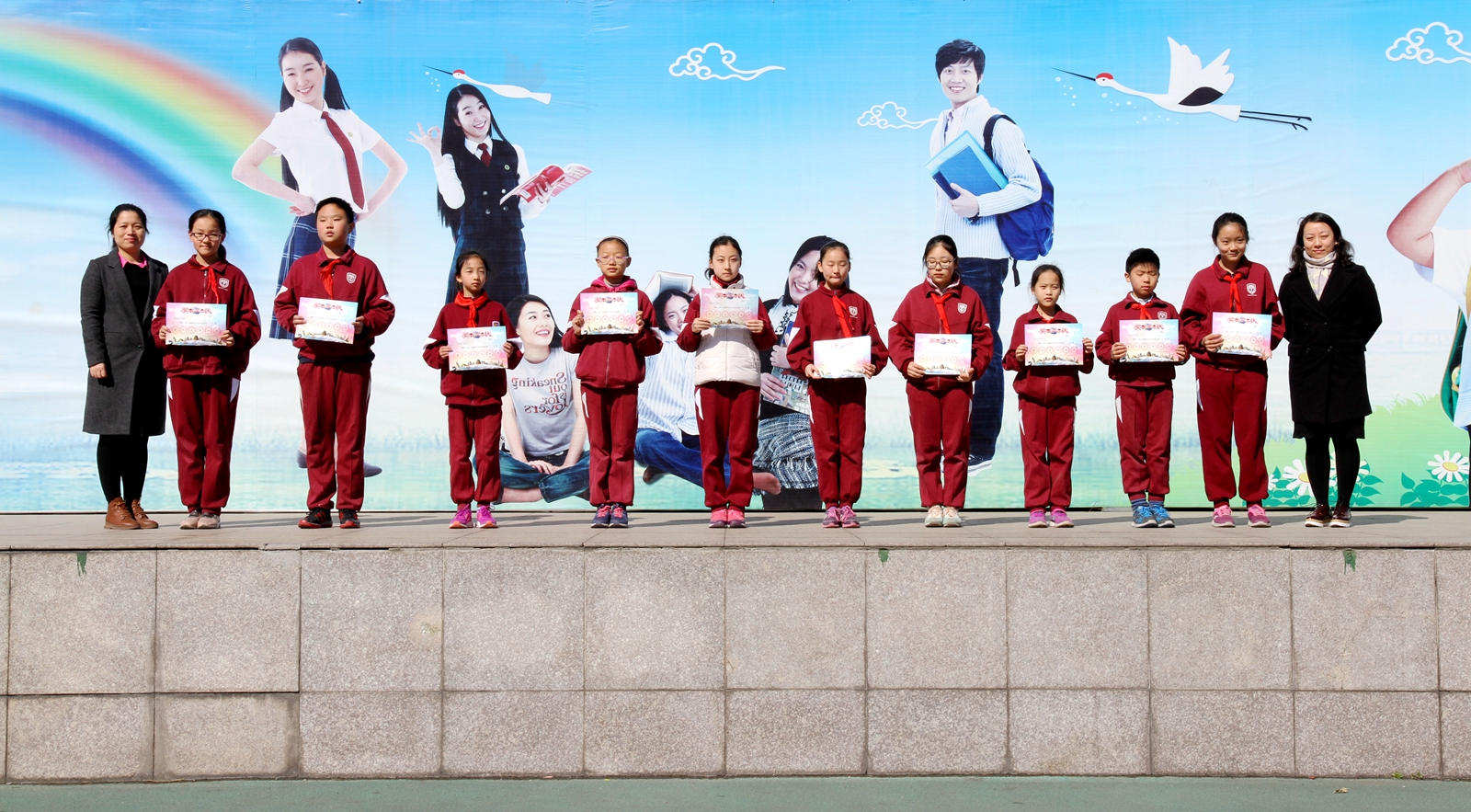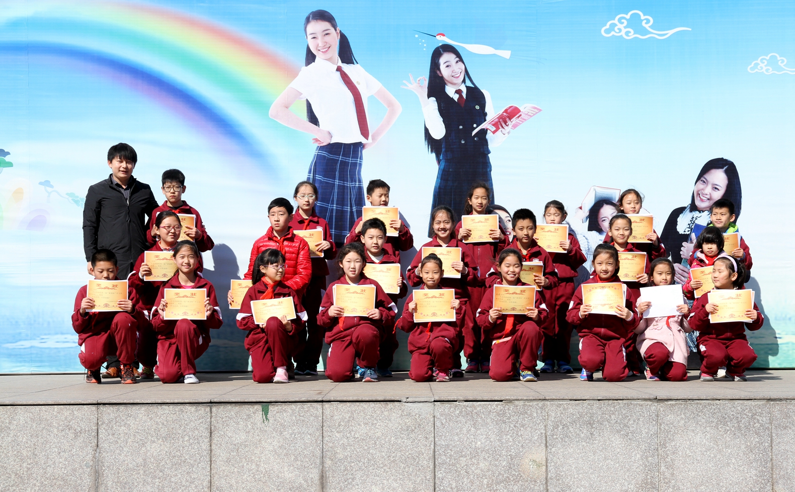 最后,大队辅导员席老师公布了获奖名单,获奖学生代表上台领奖。校领导孟校长、孙校长、李校长颁发了奖状。