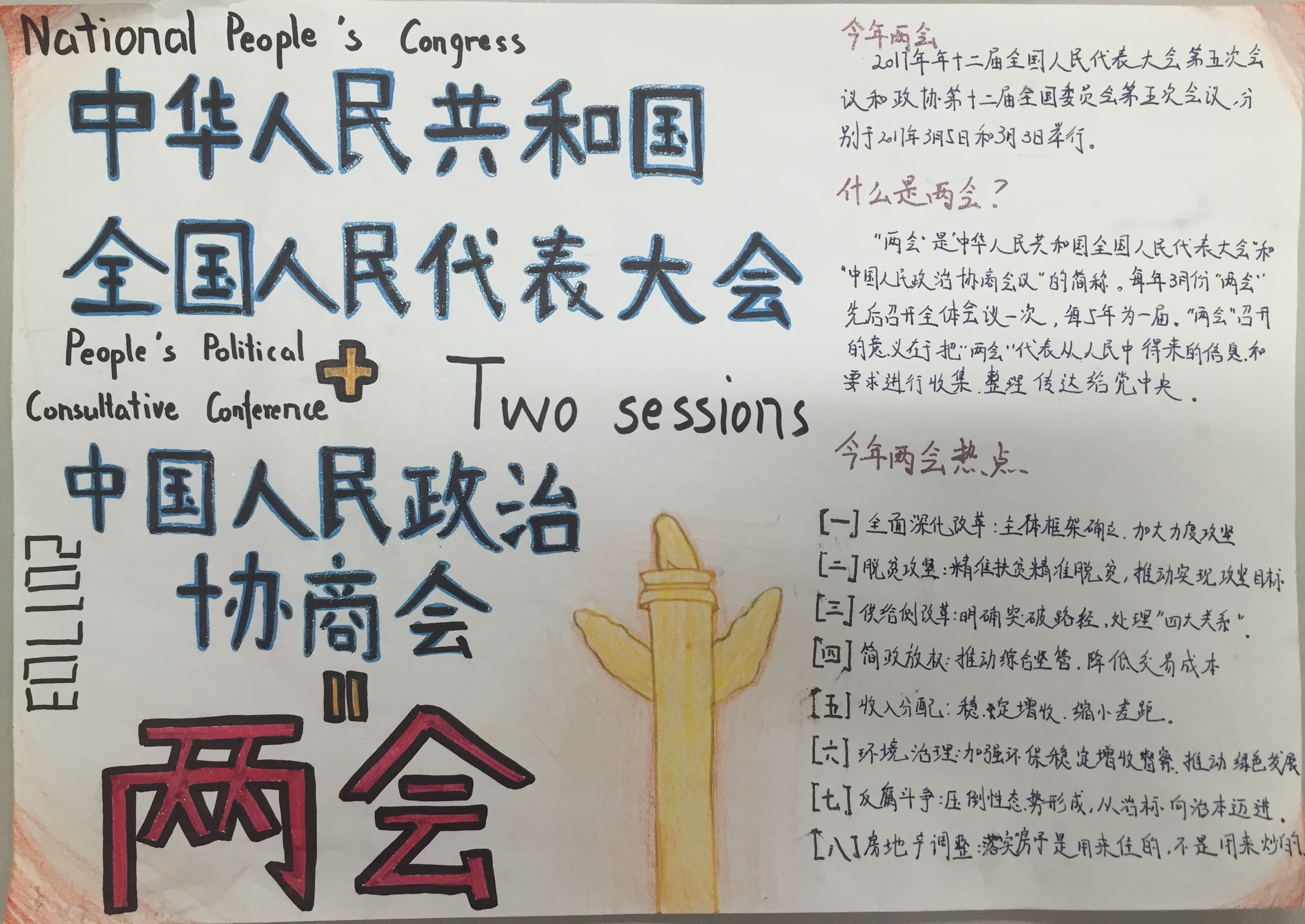 对于初一、初二的学生而言,“两会”是一个相对陌生的词语,而对于初中政治学科而言,“两会”是每一位同学应当知道的学科常识。通过查阅资料和观看相关视频,学生们的手抄报内容丰富多样,两会常识、议程、代表提案等应有尽有。此外,学生们还运用了自己所学的外语,在学以致用的同时,也体现了学校的外语特色。