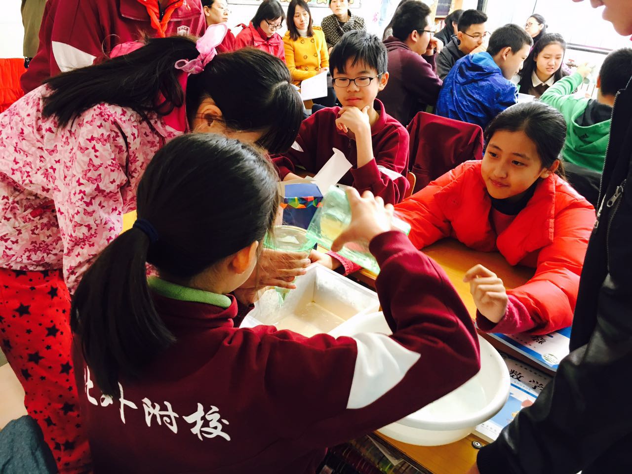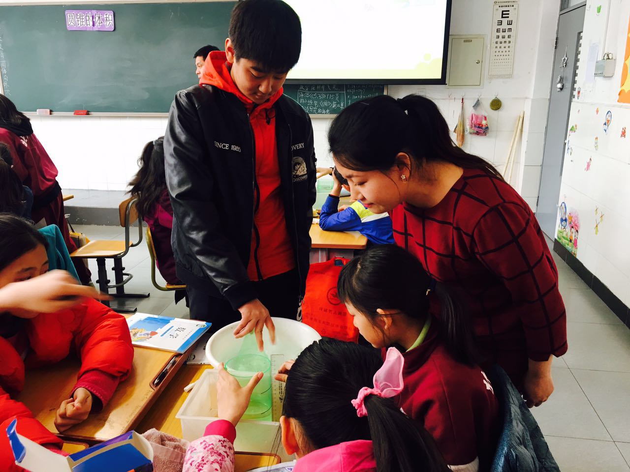 到了汇报时间,多名同学主动和大家分享自己的做法。准备等底等高的圆锥和圆柱后,有的把圆锥装满水倒入圆柱,有的把圆柱装满水倒入圆锥,还有的把圆锥放入圆柱里,看排出水的体积。积极活跃的氛围里,同学们都通过自己的实践得到了圆锥体积的计算方法。