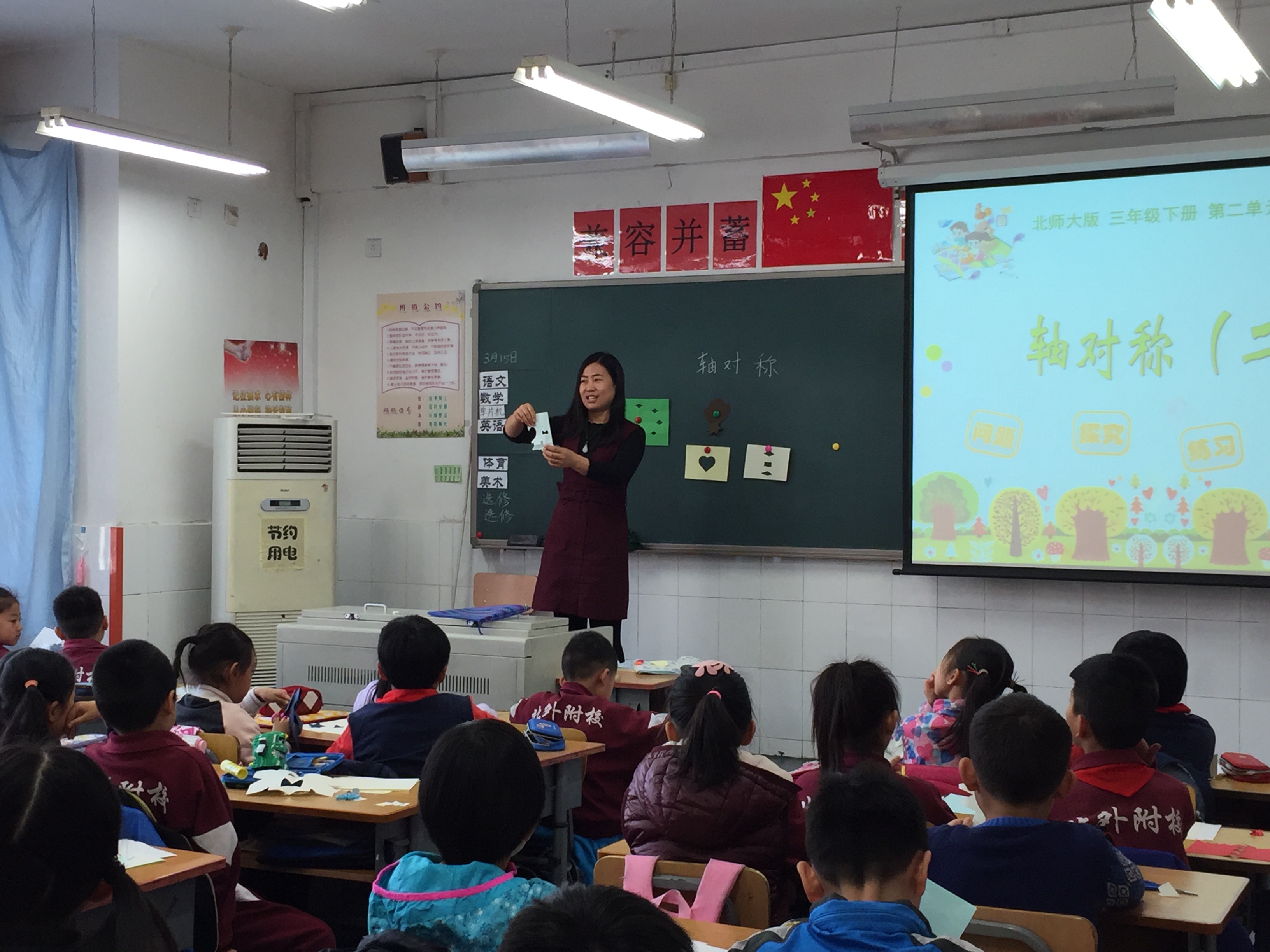 在《轴对称图形》一课上,王老师首先为同学们带来了一组美观的剪纸,请同学们静静欣赏并观察剪纸的特点,学生们在轻松愉快的氛围中开始了新知的学习,当学生们总结出“对折后完全重合”、“是轴对称图形”后,王老师给予学生充分的时间去验证,并让学生充分利用准备好的学具动手画一画、剪一剪、折一折,自己创造一个轴对称图形。学生兴趣浓厚,发言积极,参与度极高,为学生们接下来解决抽象的轴对称图形问题奠定了良好的基础,同时,也培养了学生的动手操作能力和空间想象能力。