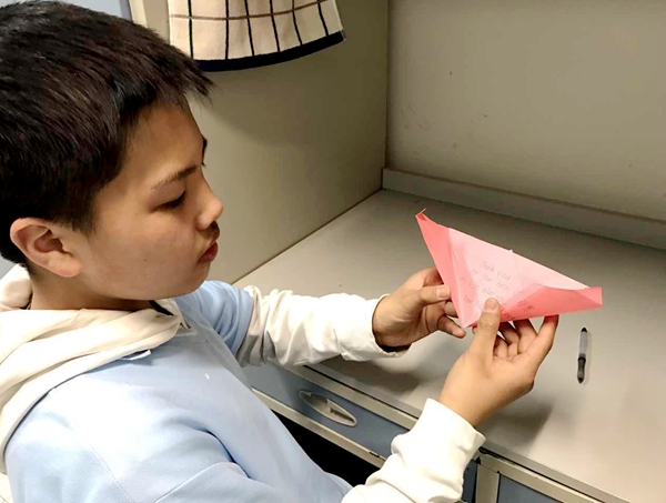 活动分为主题介绍、给妈妈写感恩信、学折纸心、感恩电话四个环节。在赵老师动情地发出了主题为“母亲最辛苦,母亲最美丽”的活动倡议及主题介绍后,同学们每人得到一张彩纸,纷纷认真拿起笔来,将内心对妈妈的感恩之情化作文字,赵老师又带领孩子们精心地将信纸折成心形,带着满满的感恩之情给妈妈打了感恩电话,感恩信将会在周末时送给妈妈。