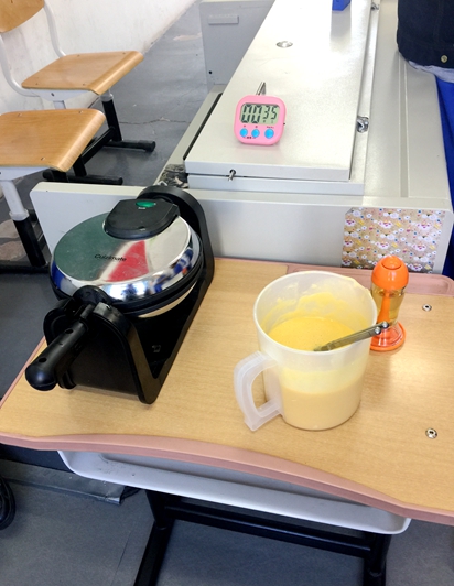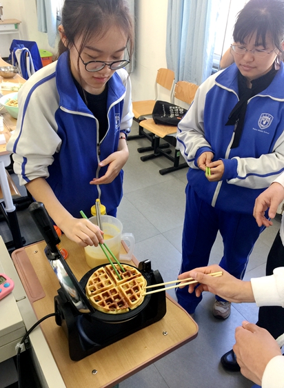 两位家长在这节课上展现的厨艺都很赞。郭先生从自己家里带来了制作华夫饼的专用炊具和材料。他耐心详细地解释了材料的用途和做法,并让每一位同学都体验一番,亲手烤制一个甜香四溢的华夫饼。同学们吃了自己做的华夫饼,都赞不绝口,争相上前制作。程女士则制作了一道色香味俱全的酱香砂锅排骨。虽然同学们没有参与这道菜的制作,但都十分认真地听程阿姨讲解了制作过程。