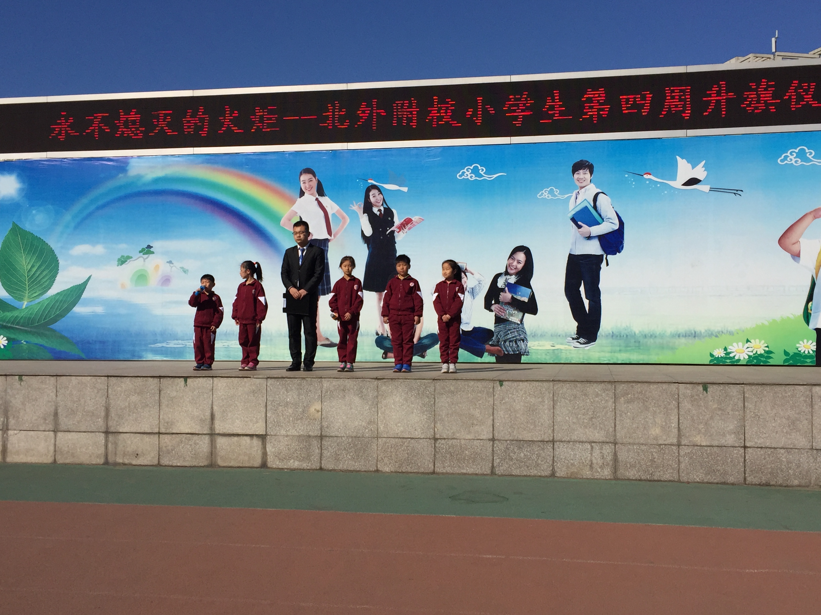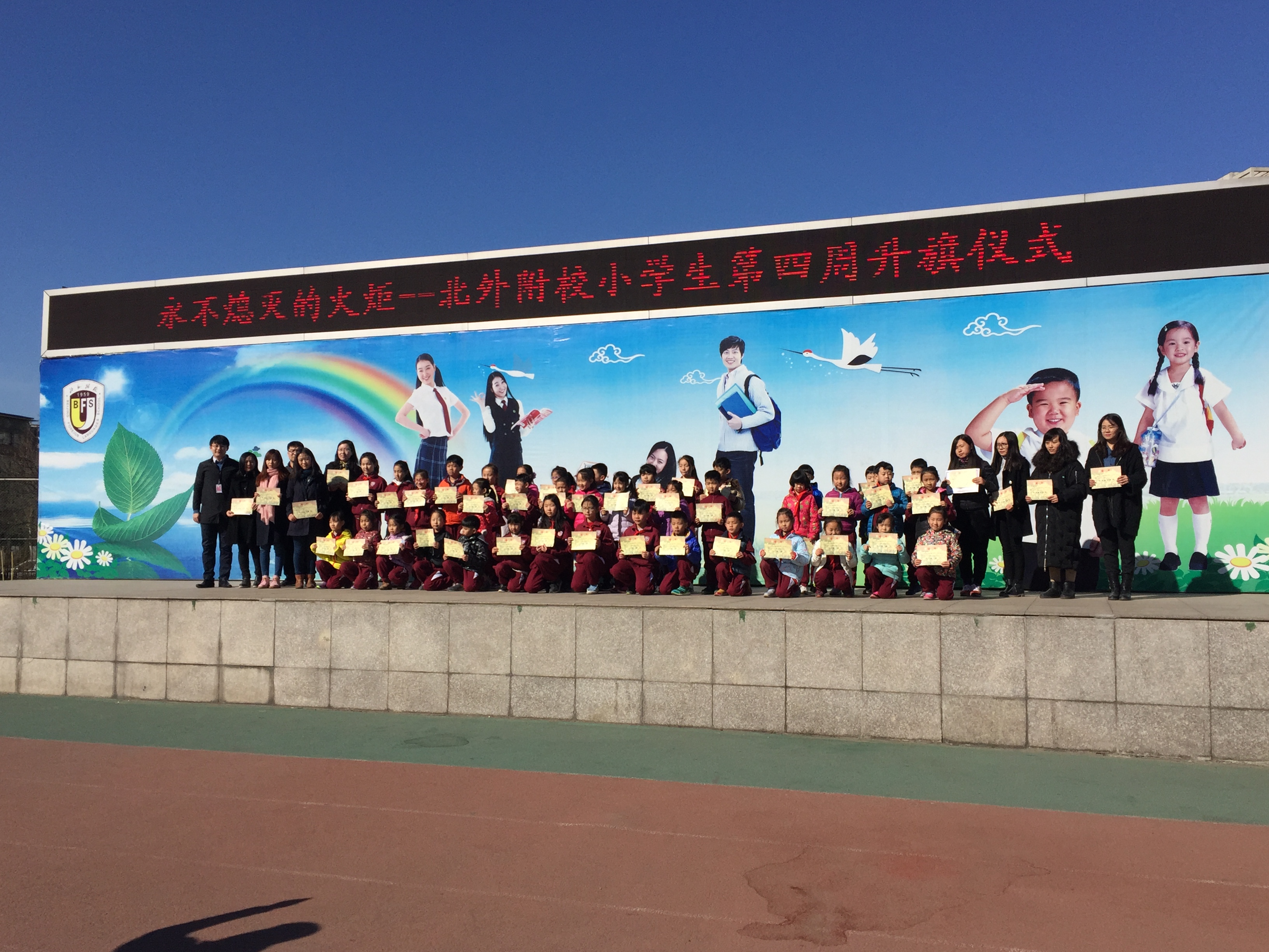 升旗仪式上,对在海淀区“中小学生科技幻想画”比赛和北外附校“校园金话筒”主持人大赛活动进行了表彰并颁发了奖状,北外附校小学副校长孟娜、谈固小学校长杨芳为获奖学生颁奖并合影。