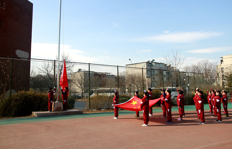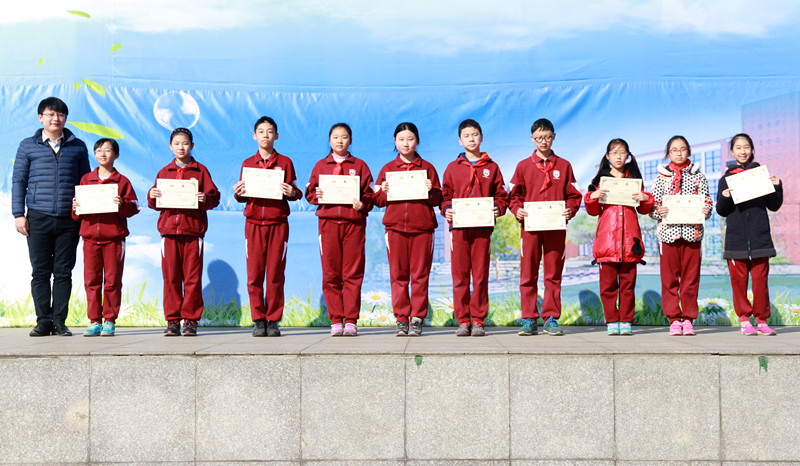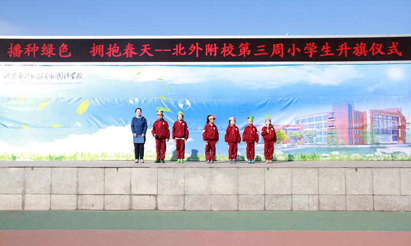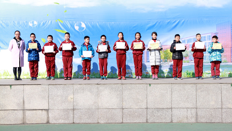 升旗仪式上,学校对海淀区“动手做”比赛和单片机全国赛进行了表彰并颁发了奖状,北外附校小学副校长孟娜为获奖学生颁奖并合影。