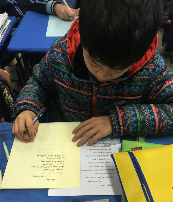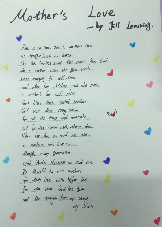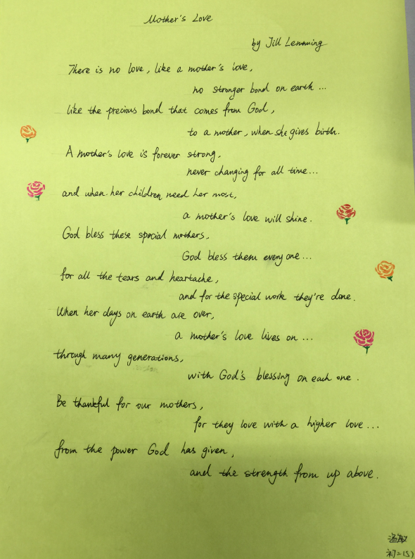 2017年3月8日是第108个国际妇女节,初二年级举行“致敬母亲”英文诗歌书写活动,