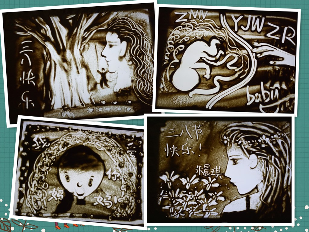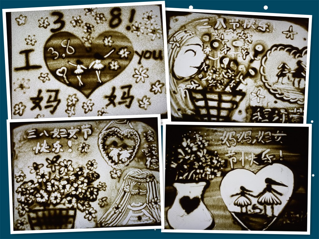 沙画是一种新型的绘画形式。它是由微妙精细的观察能力、形象的思维能力、高效的记忆力、创造的想象力,再加上双手的协调运动和丰富的表达能力组成的。在第108个国际妇女节来临之际,我校小学生们在沙画课上为妈妈们画出一份美好的祝福,下面我们来欣赏一下孩子们的作品。