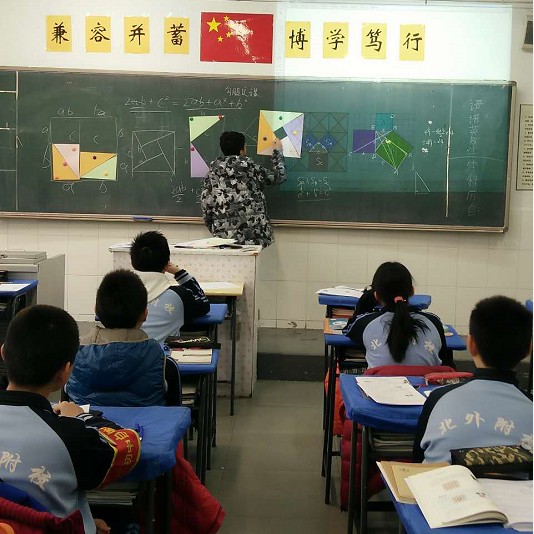 初二下数学起始章节为勾股定理,它是欧式平面几何中的一个核心命题,世界上各个文明古国对勾股定理的发现和研究都做出过贡献,特别是定理的证明,据说方法有400余种,很多中外数学家根据面积割补原理给出了定理的多种证法,它不仅成为训练思维能力的健身器,而且其成果又构成了一座美丽的数学花园。数学组对此开展了一节主题为“勾股定理的多法证明”活动课。