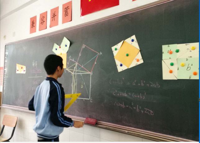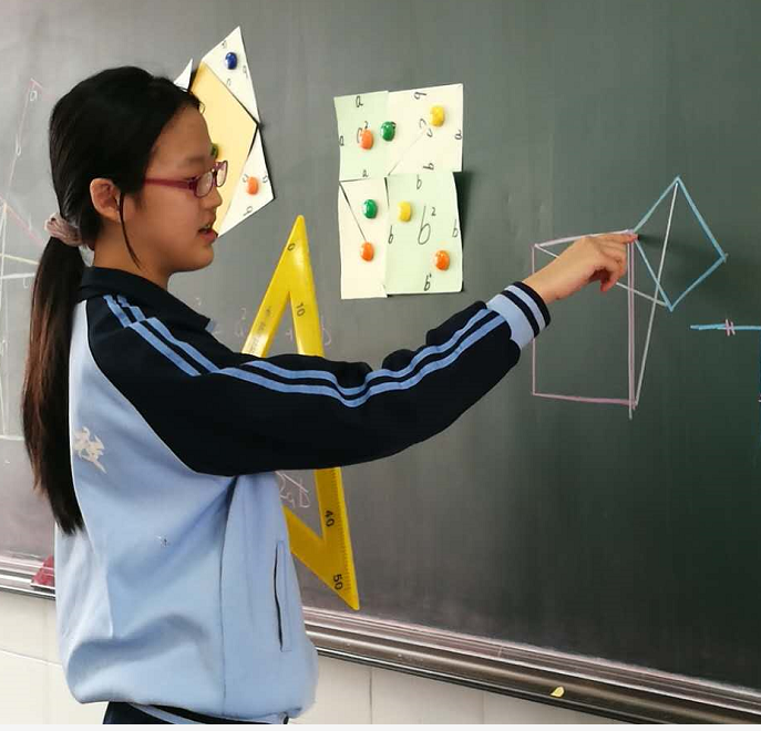 课前老师们引导学生搜集、研究相关资料,不少同学绘制了绚丽详实的手抄报;还精心准备教具、设计活动流程。活动课上,学生积极思考、动手尝试拼割、构图、画图,利用多种方法展示自己的证明过程,各个神采奕奕,赞赏声仄仄不平。对于较难一点的方法,教师最后给与了拓展证明,使学生们受益良多。数学证明的魅力和精彩的讲解激发了学生学习数学的兴趣、获得了数学学习的成就感。