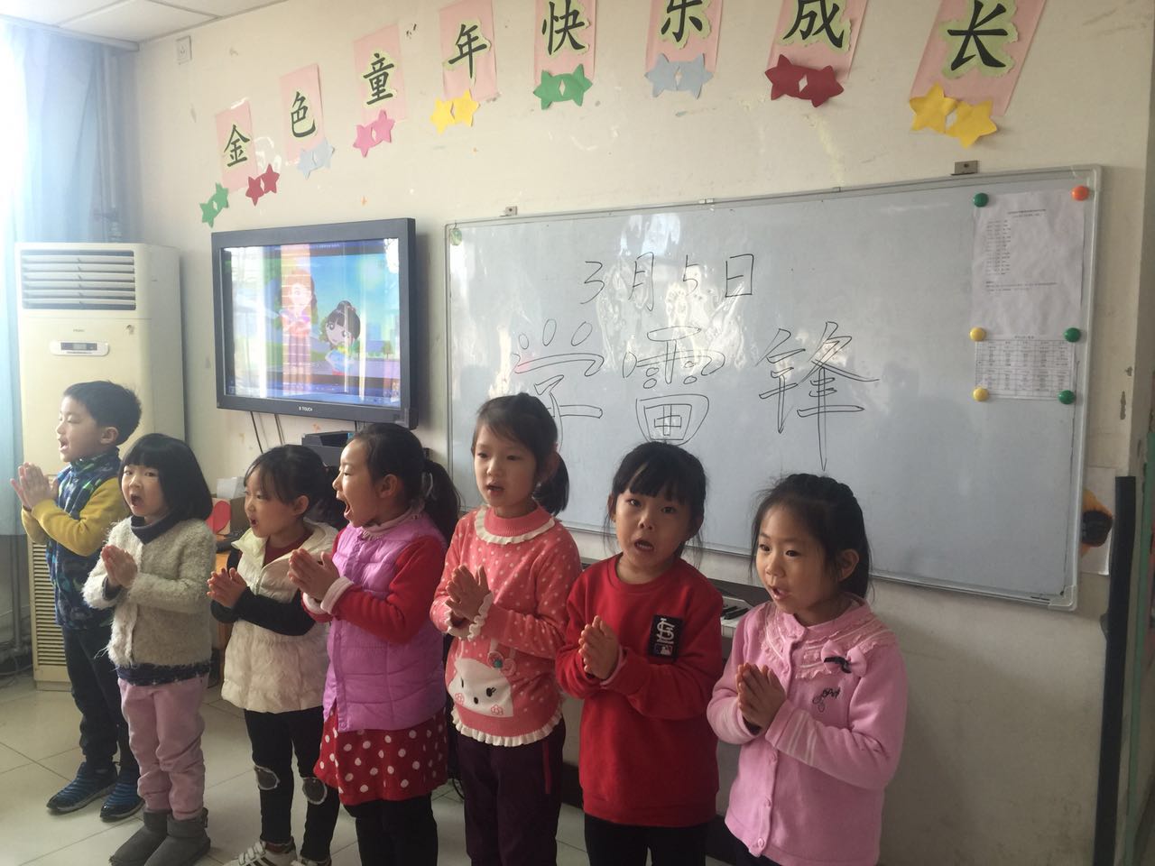 活动在各班教室有条不紊地进行,首先是班主任向小朋友们介绍雷锋的生平事迹,让孩子们知道雷锋是谁,我们为什么要提倡学习雷锋精神;其次是观看《好事做了一火车》的动画视频,用最直观的动画视频向孩子们展示了雷锋不计较个人得失为人民做好事的感人事迹;最后是组织孩子们学唱《学习雷锋好榜样》经典红色歌曲和央视雷锋工艺广告——《童谣》,值得一提的是此童谣画面丰富,读起来也郎朗上口,孩子们很快就背下来了。