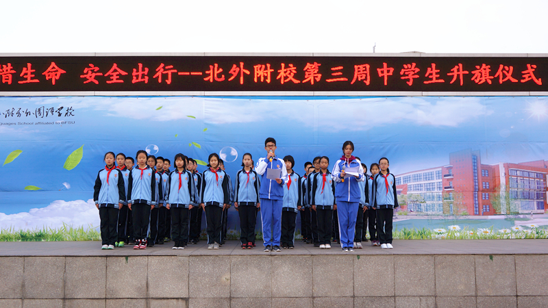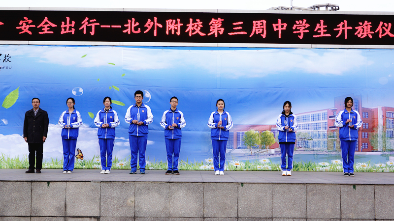 3月6日,我校举行主题为“珍惜生命,安全出行”的中学生第三周升旗仪式。升国旗前,主持人介绍了国歌领唱班级初一(2)班和该班升旗手丁博皓同学。本周升旗仪式的双语主持是高一年级的张宇霏和王博祯同学。