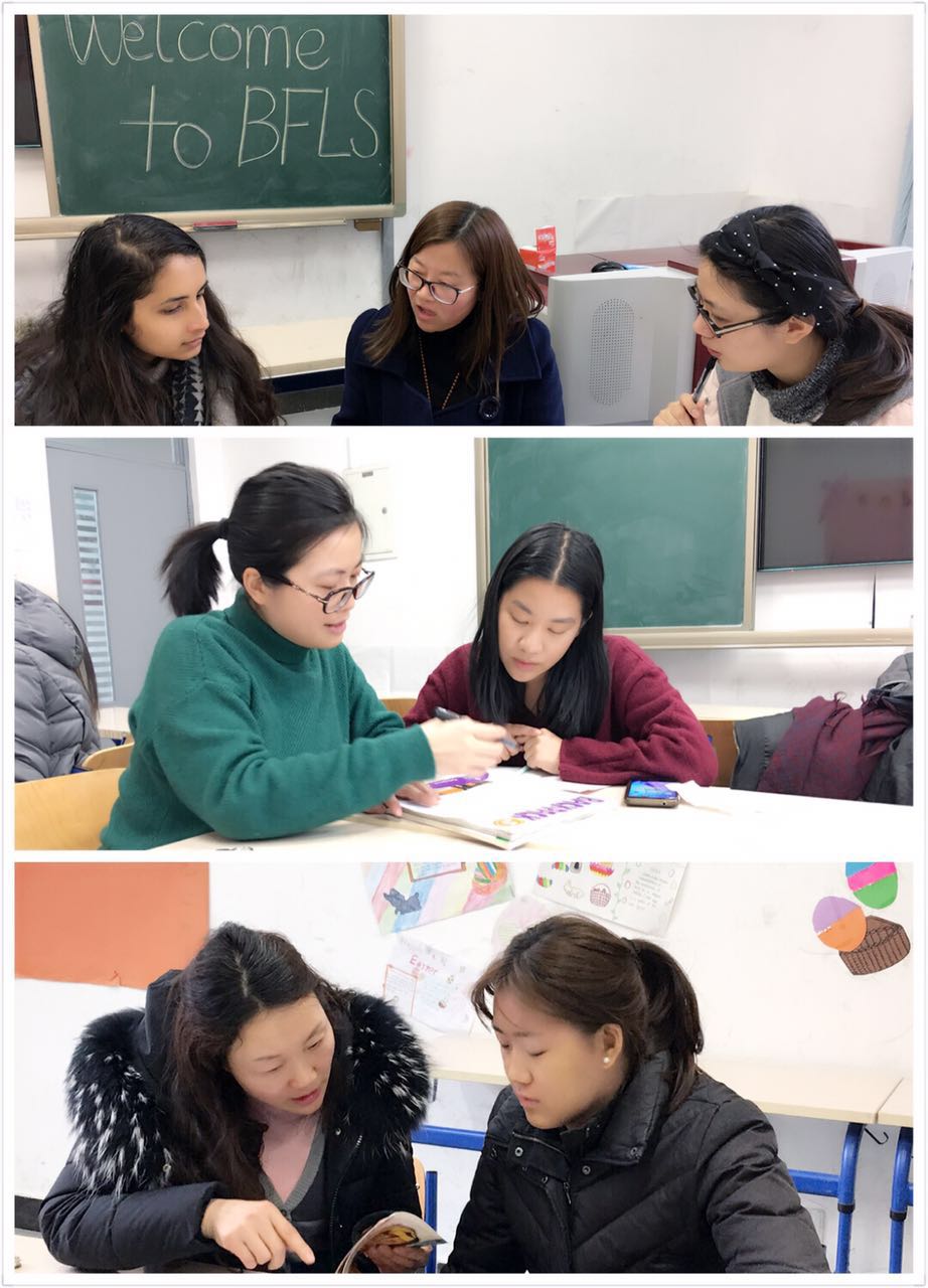 (各备课组长细致耐心地对外教进行指导)