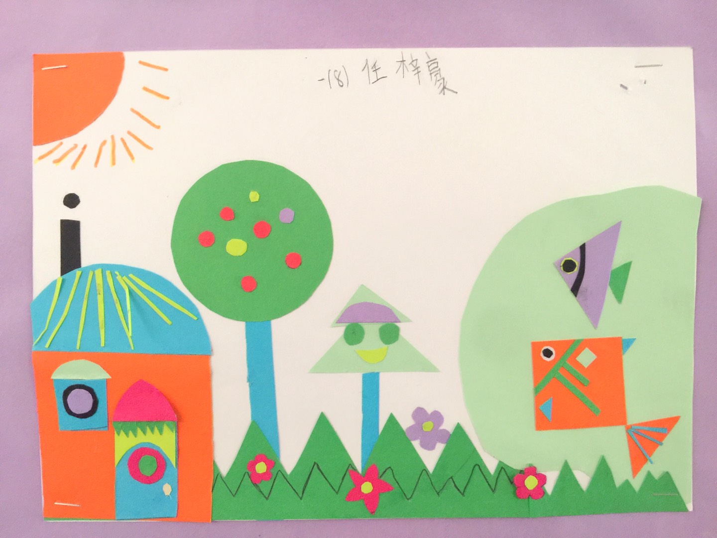 在本学期,学生们学习了立体图形,对图形有了一定的认识。学生将彩纸剪成不同的平面图形,再将这些图形进行组合,形成一幅完整的画。使学生在操作中逐步加深对平面图形的认识。感受图形与日常生活的密切联系。