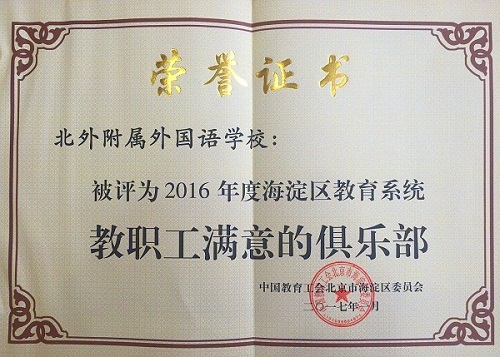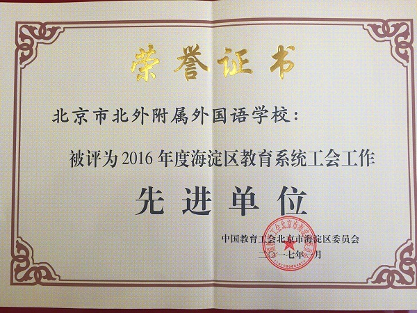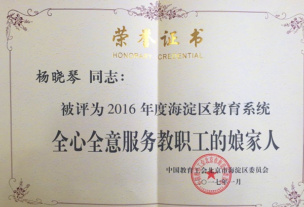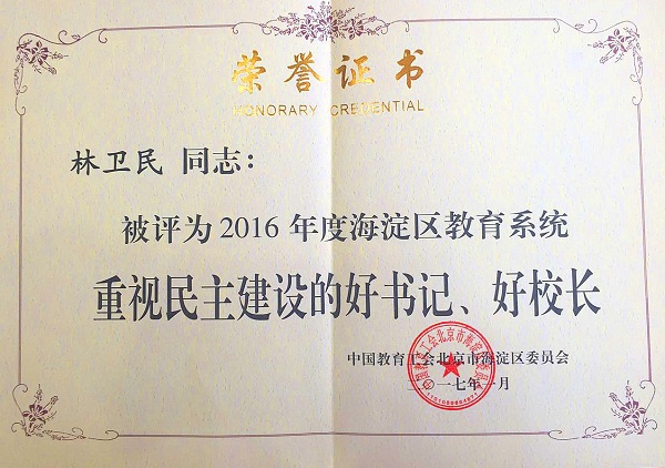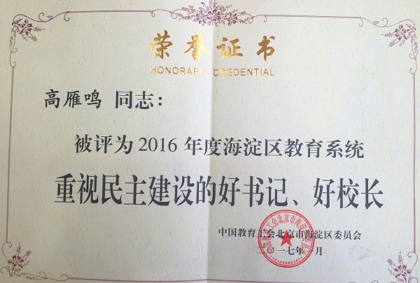 近期,在海淀区教育工会先进单位、先进个人及“四个一批”评选活动中,我校荣获多项集体和个人荣誉,其中学校工会荣获“模范职工之家”、“2016年度海淀区教育系统工会工作先进单位”,我校校长林卫民荣获“重视民主建设的好校长”,副校长、副书记高雁鸣荣获“重视民主建设的好书记”,工会主席杨晓琴荣获“2016年度全心全意服务教职工的娘家人”,校工会承办的区教工瑜伽俱乐部荣获“教职工满意的俱乐部”等多项荣誉。