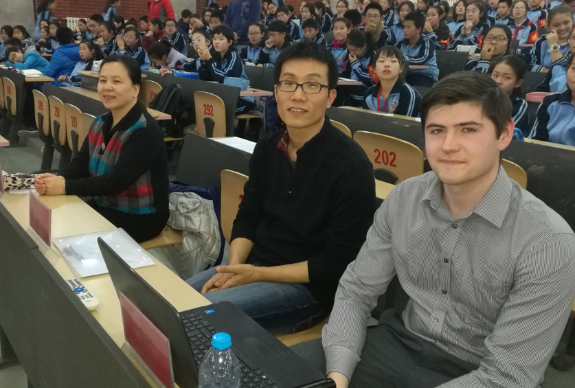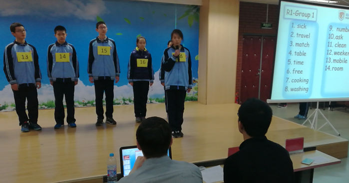 因为有了前一天的彩排,今天的活动开展起来非常顺利。比赛开始前,张丽君老师宣布了比赛规则:外教老师清楚地读出每一个单词,轮到的选手要在10秒钟内准确地拼出这个单词的字母;如果选手对这个单词不熟悉,可以请求老师说说这个单词的意思或者用这个单词举一个例子, 但是每个人只有一次求助的机会;如果没有拼对,就要出局。宣布完比赛规则后,来自8个班的32名选手进行了一轮又一轮的PK, 场下的观众们一次次给予选手们热烈的掌声。