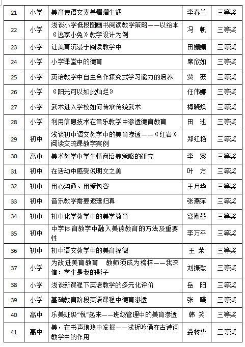 2016年上半年,我校教师在北京市教委体卫艺处、北京教育学会美育分会主办的第九届“京美杯”论文评比活动中表现出色,共有41名教师取得佳绩。其中有4名教师荣获一等奖,16名教师荣获二等奖,21名教师荣获三等奖。