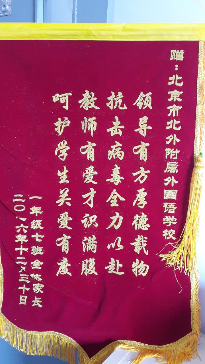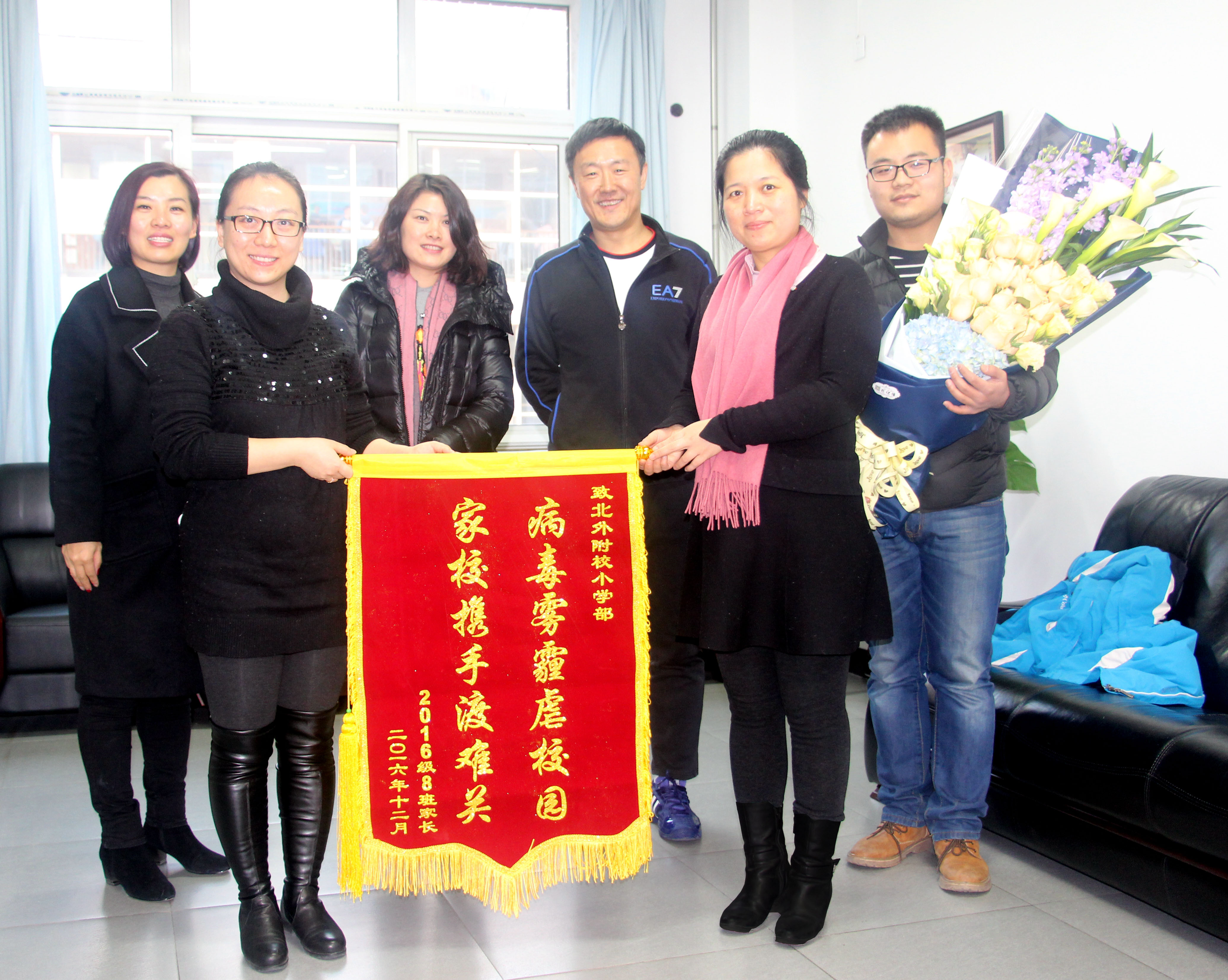 2017年1月13日,一年级八班的家长代表为学校送上锦旗:锦旗绣着“病毒雾霾虐校园,家校携手渡难关”。小学副校长孟娜、李琳代表学校参加接锦旗仪式。