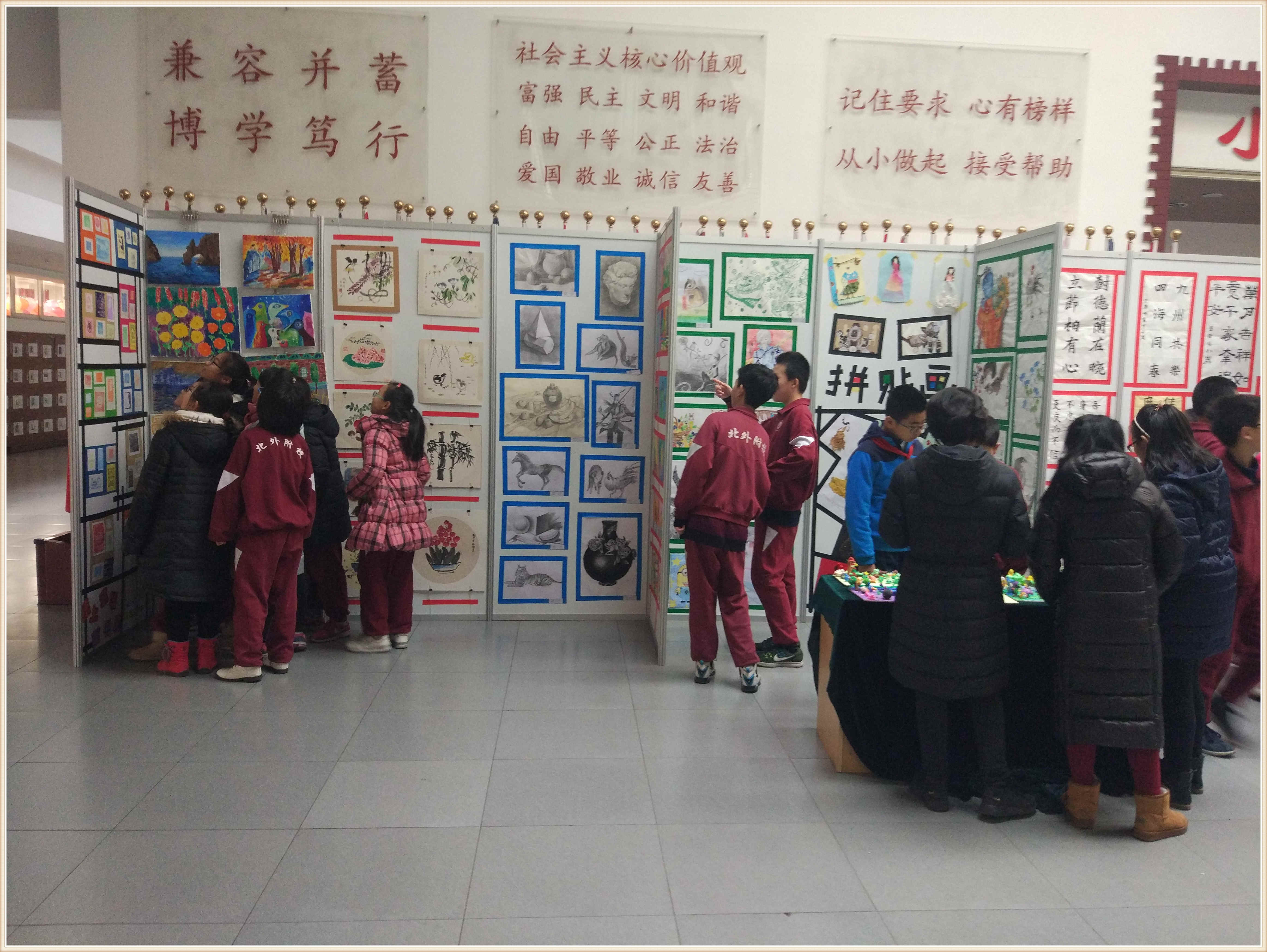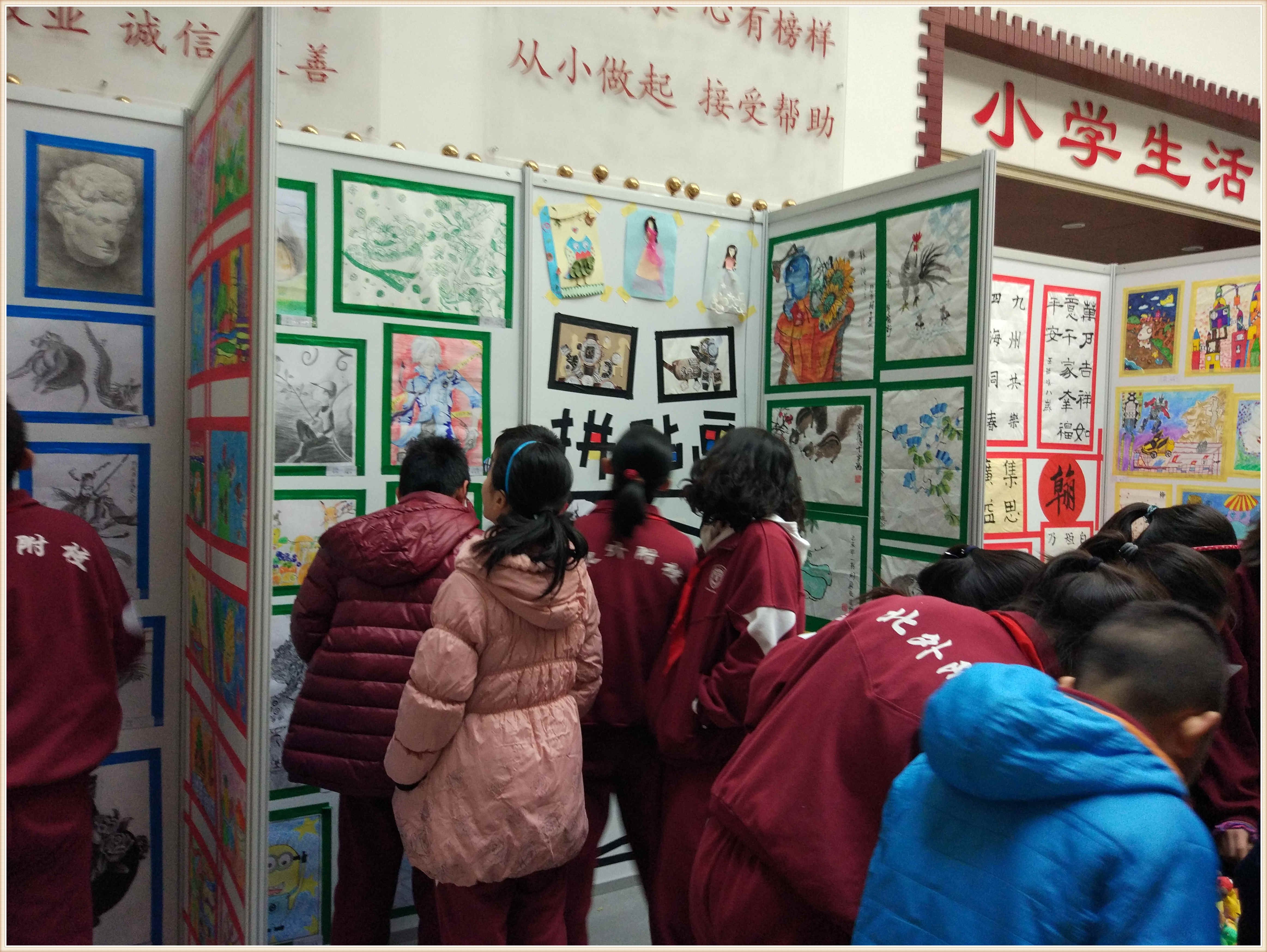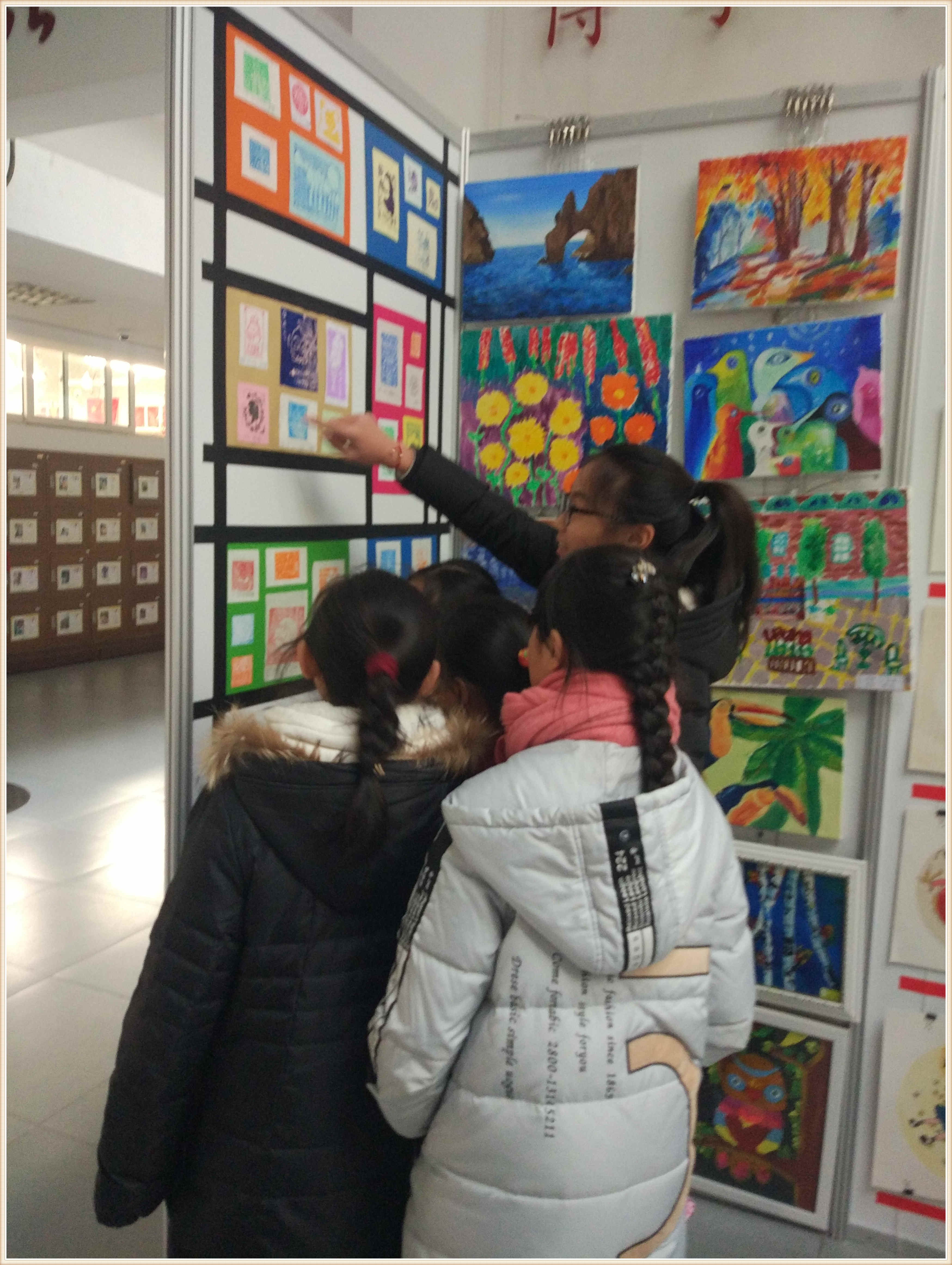 进入小教楼的展览厅,学生们马上被室内的展品吸引住了,这里的作品形式多样。学生们在老师的带领下首先参观了软笔书法展,那些笔走龙蛇的诗句和苍劲有力的书法作品,有的豪放、有的优雅生动,各具特色的风格让学生们赞叹不已。接着,大家参观了绘画作品,这里的作品内容丰富,有清新淡雅的水墨画、别具一格的油画、惟妙惟肖的拼贴画……这一幅幅精美的画作都是我校学生不懈努力的成果。