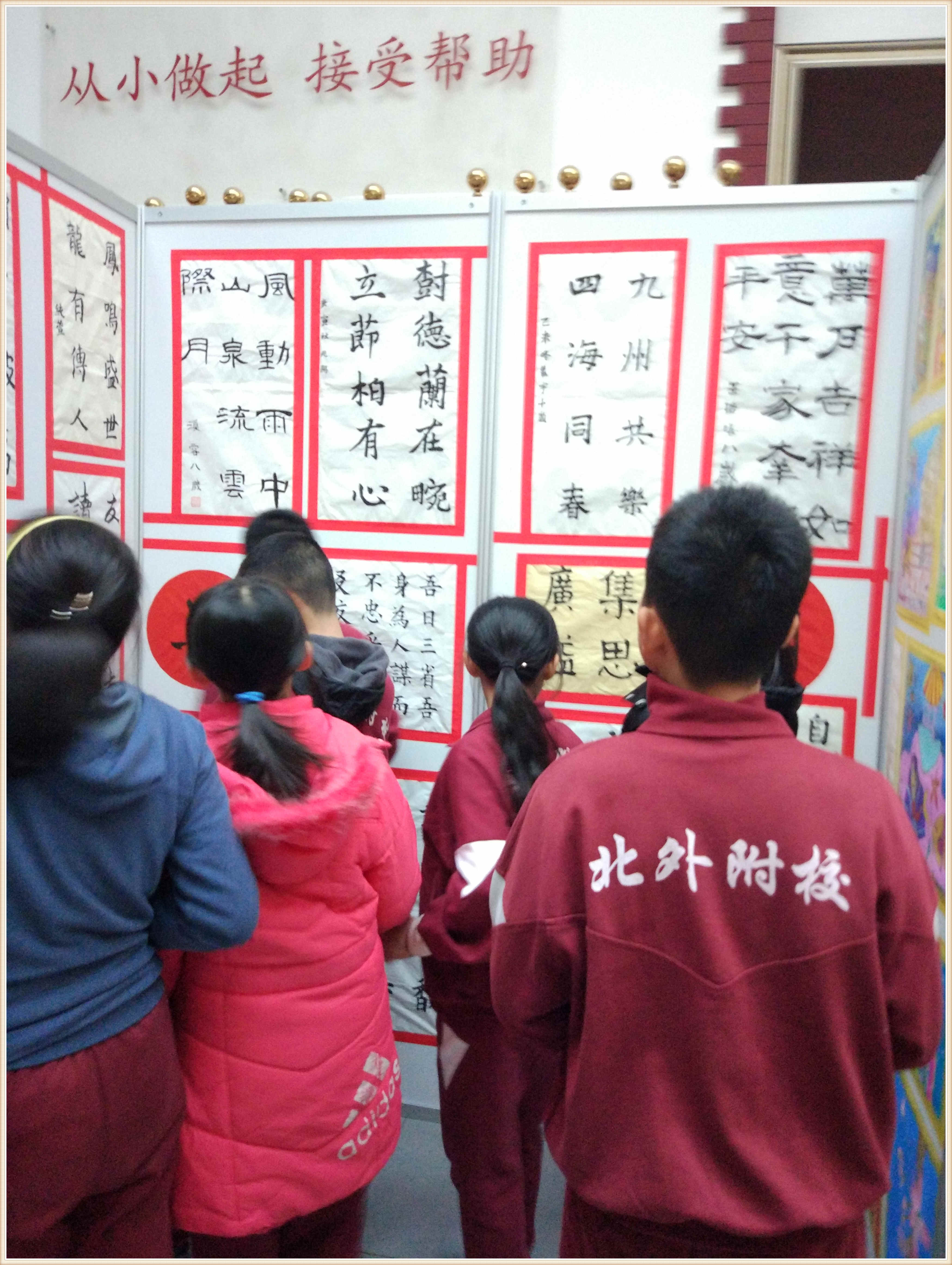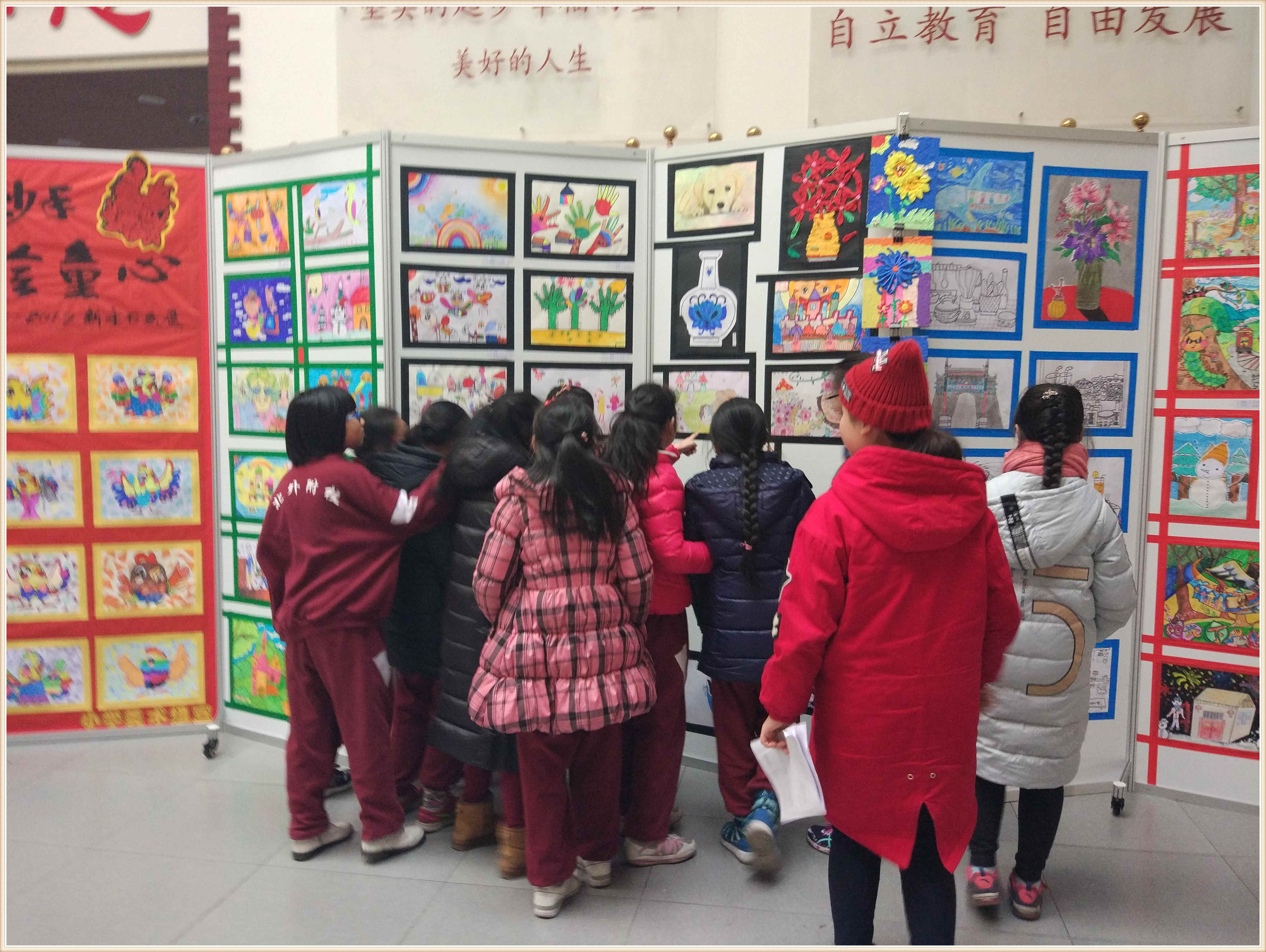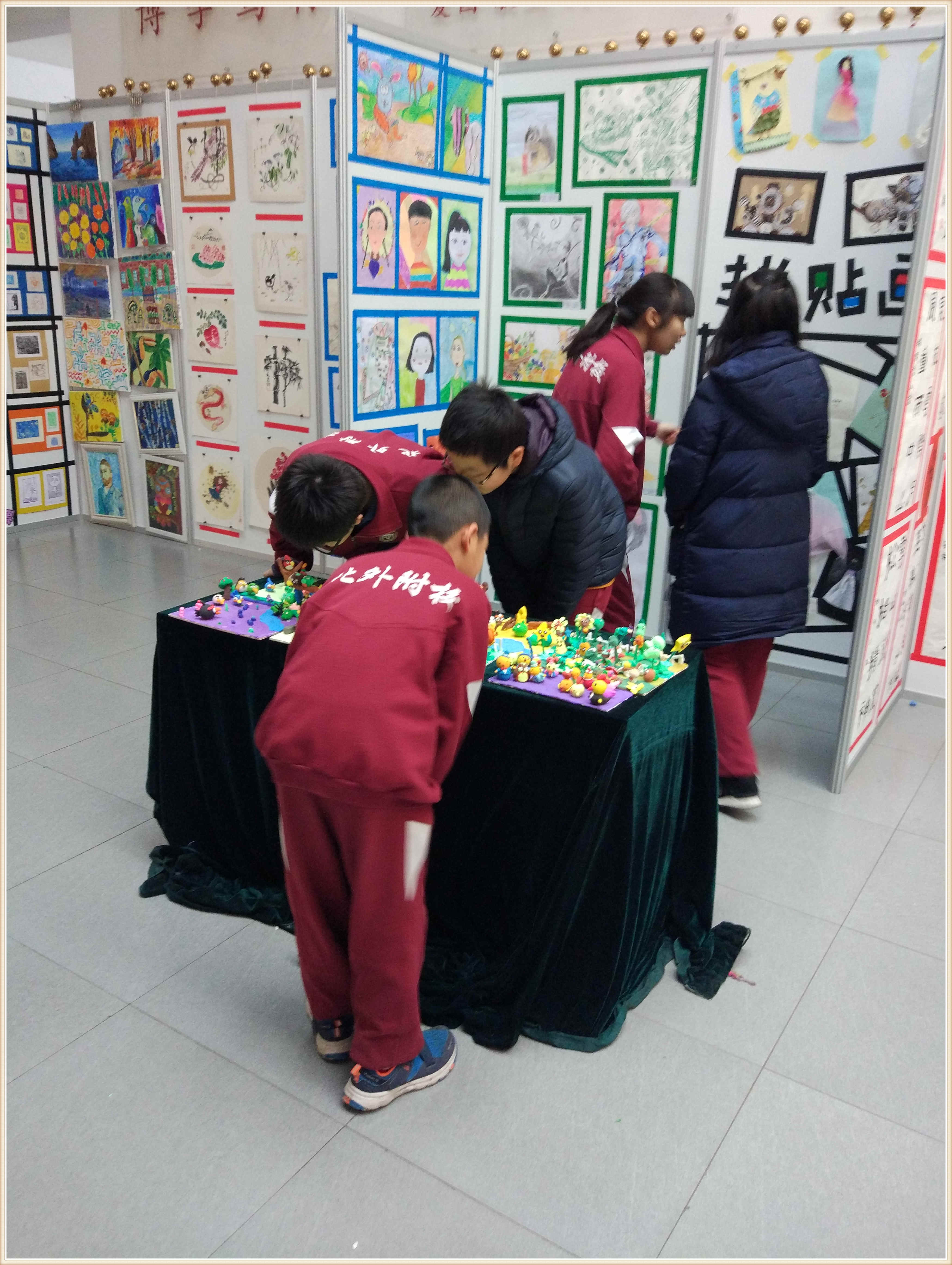 进入小教楼的展览厅,学生们马上被室内的展品吸引住了,这里的作品形式多样。学生们在老师的带领下首先参观了软笔书法展,那些笔走龙蛇的诗句和苍劲有力的书法作品,有的豪放、有的优雅生动,各具特色的风格让学生们赞叹不已。接着,大家参观了绘画作品,这里的作品内容丰富,有清新淡雅的水墨画、别具一格的油画、惟妙惟肖的拼贴画……这一幅幅精美的画作都是我校学生不懈努力的成果。