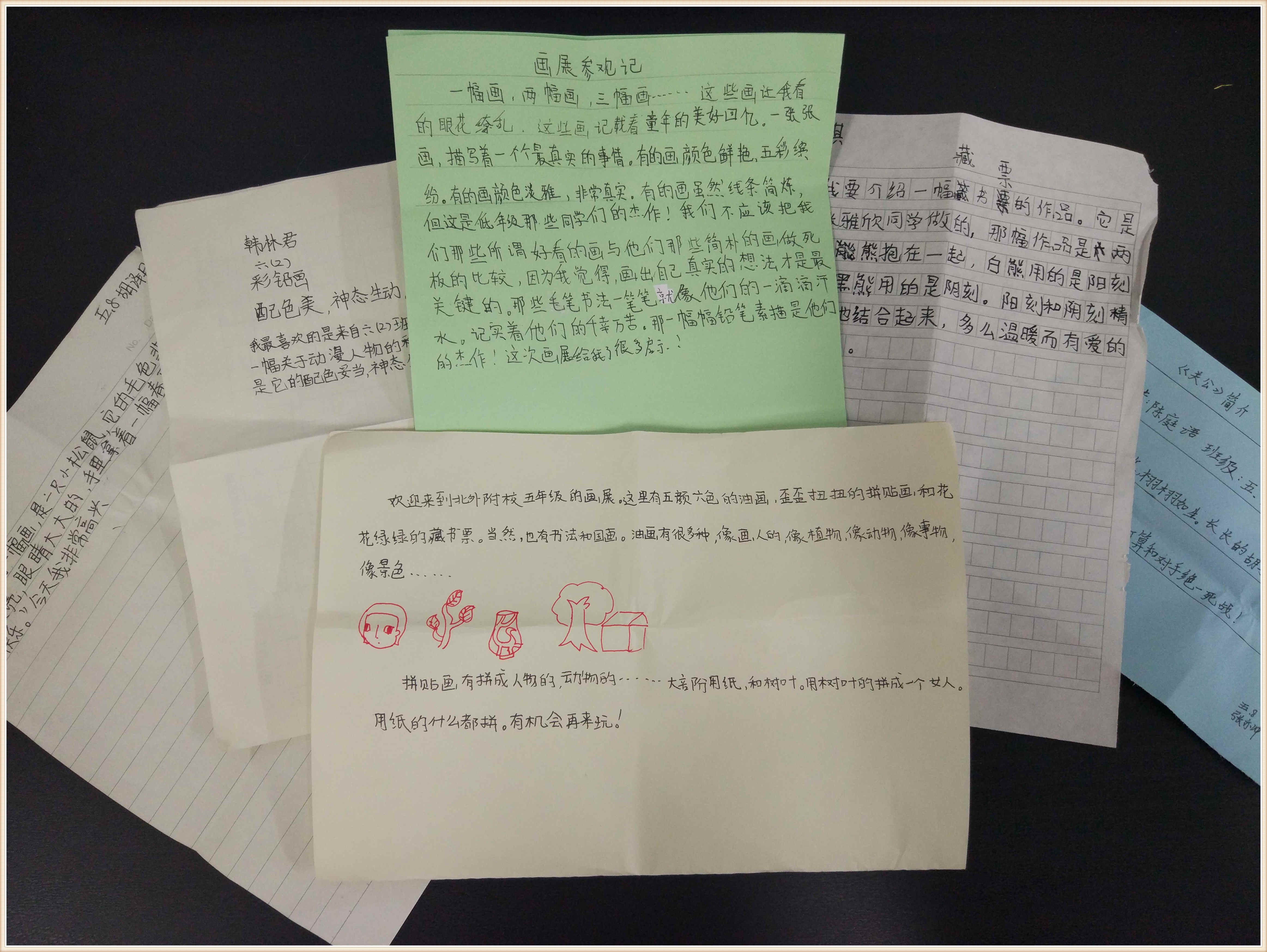 回到教室里,学生们还写了观后感,把观看后的所思所想都用自己的语言表达了出来,有的同学直接表达了对某幅作品的喜爱之情;有的同学则把自己当成了小导游,向游客介绍画展的内容;还有的同学励志下次画展一定要展出自己的作品……
