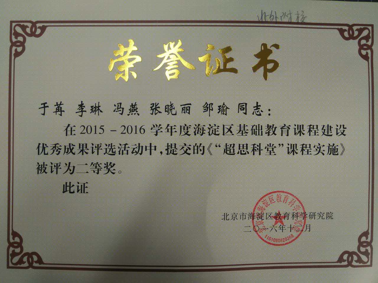 在2015——2016学年度海淀区基础教育课程建设优秀成果评选活动中,由于苒负责,李琳、冯燕、张晓丽、邹瑜课题组成员参与的《“超思课堂”课程实施》被评为二等奖。