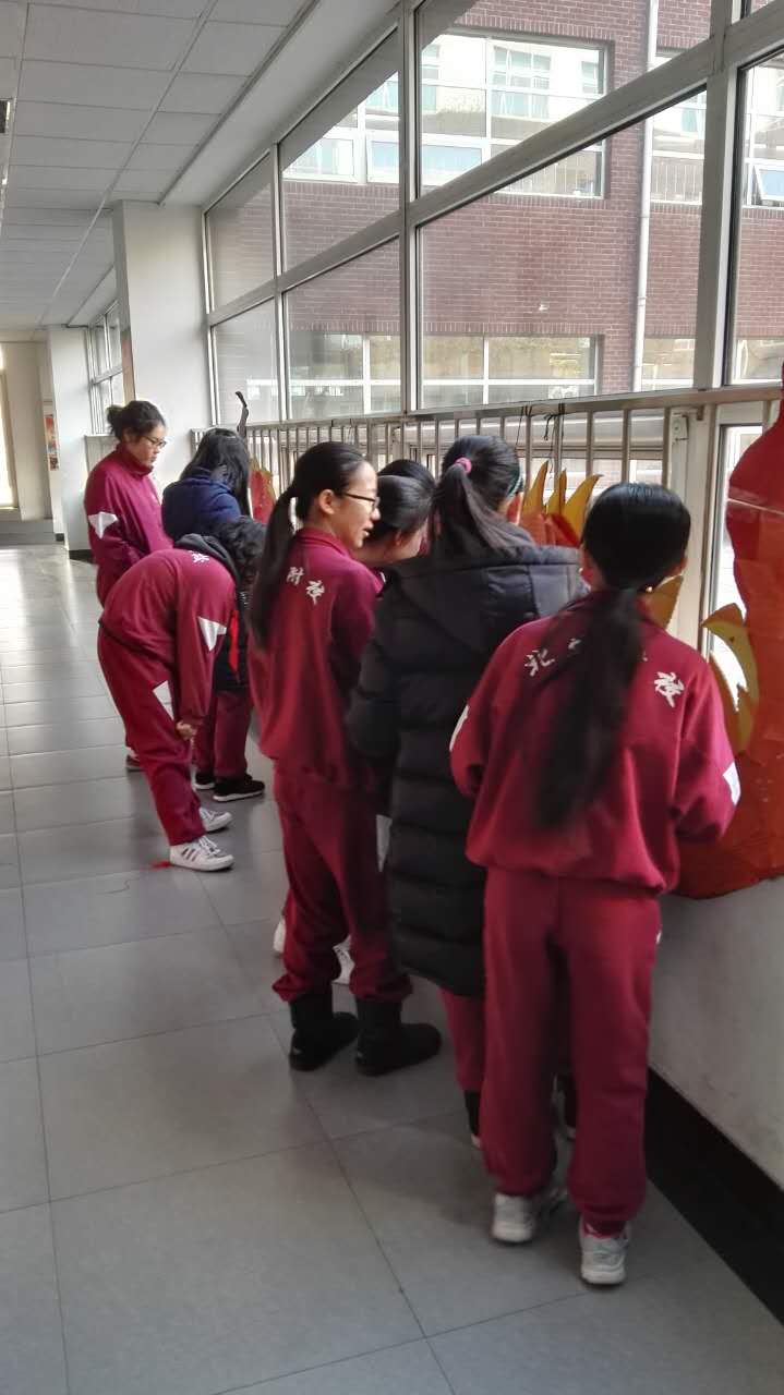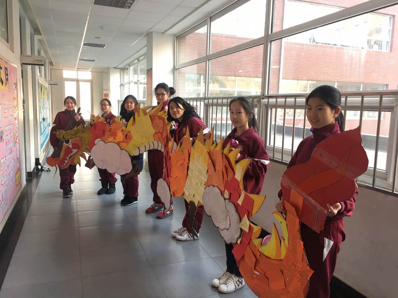 来自六年级各班的20余名学生聚集在一起,首先设计图案,然后分工合作。有些学生负责在纸箱上勾勒出龙的轮廓;有些学生负责沿线条修剪出龙的轮廓;有些学生备好颜色为龙添彩;有些学生安排各个班级书写内容和所需纸张颜色。六年级全体学生的作品按照顺序依次被粘贴在龙的身上。学生的作品书写在颜色为黄、红、橙的纸张上,远远望去,就如一条真龙盘旋在楼道的墙面上,供每个学生欣赏和选出最佳作品班级。