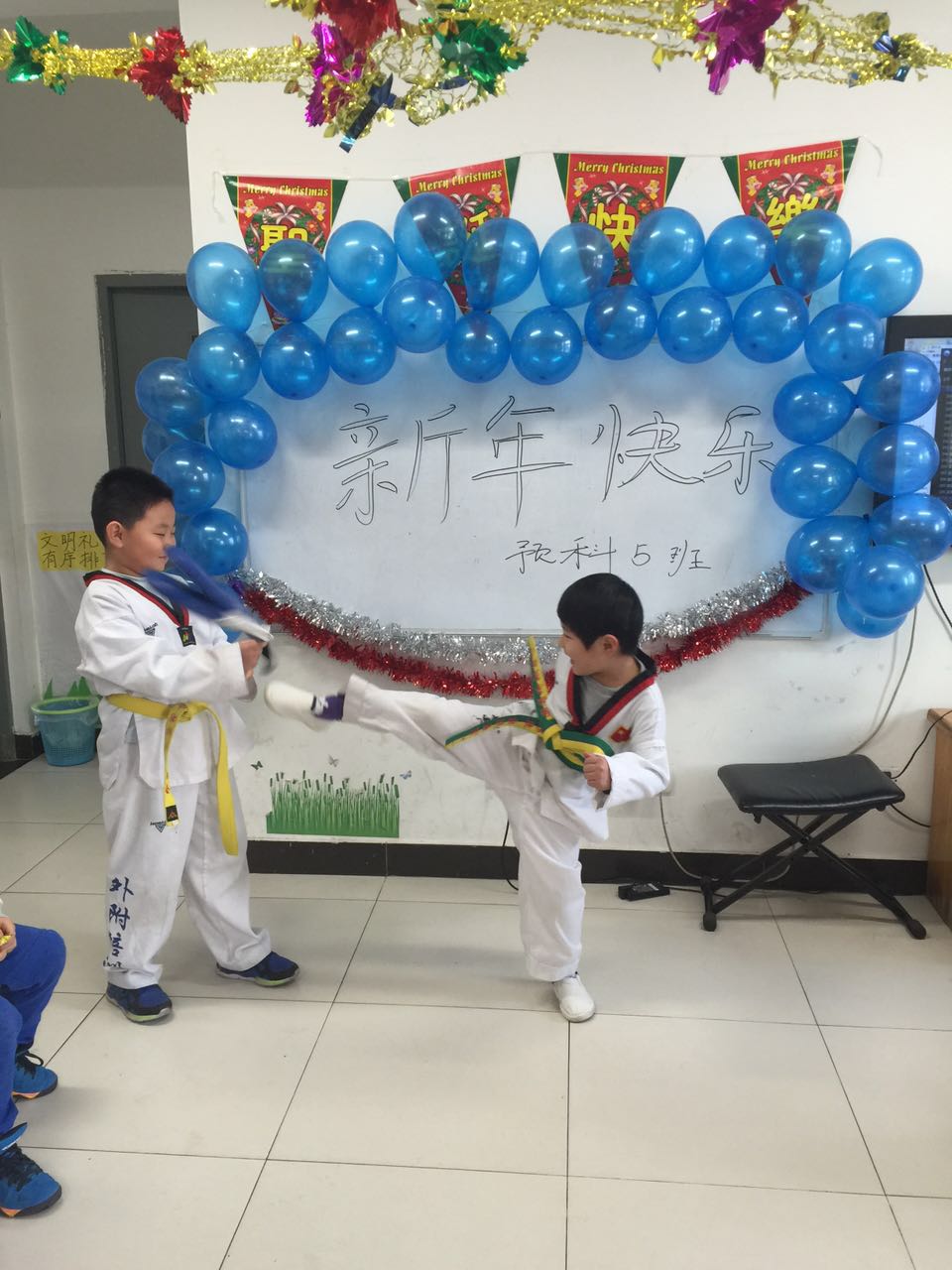 为了让教室充满的节日的氛围,在联欢会前2天,老师们就开始精心布置教室、孩子们也在准备展示的节目。联欢会上孩子们表演了舞蹈《喜洋洋和灰太狼英文版》、《baby tree》、《勇敢向前》、《小黄鸭减肥》、《战豆》等,还有气势恢宏的武术操、跆拳道表演;优美动听的钢琴表演,都为我们的联欢增光添彩,精彩的节目将联欢会的欢乐气氛推向了高潮,最后联欢会在优美歌曲《新年好》中落下了帷幕。