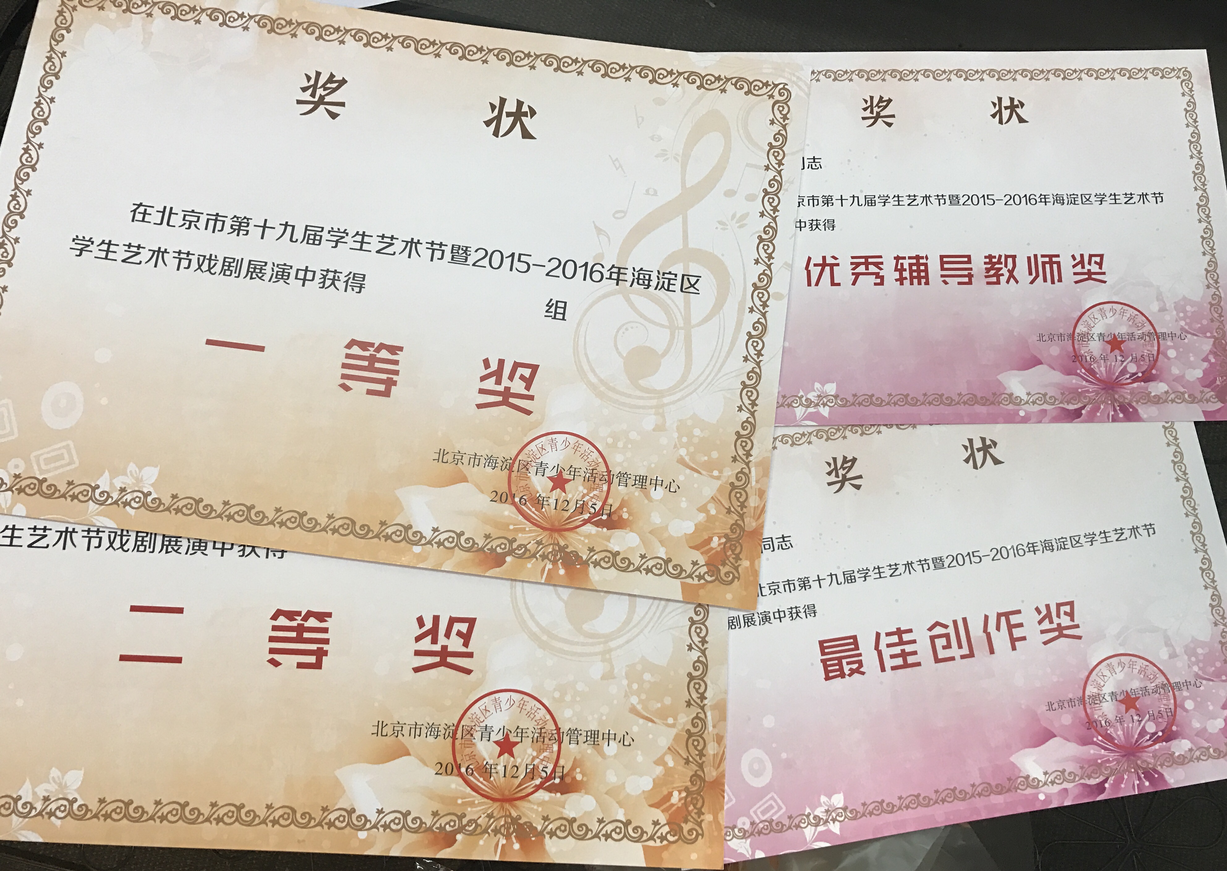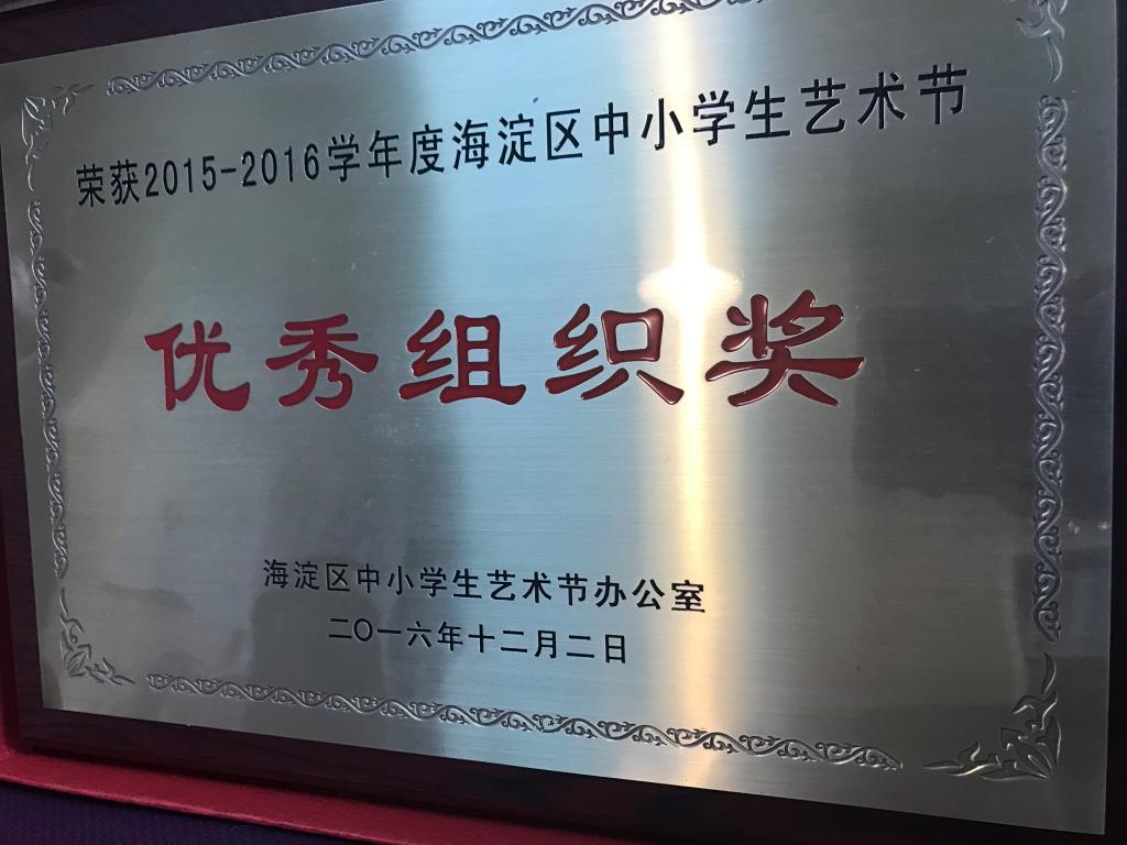 我校“Sunshine艺术团”在北京市第十九届学生艺术节暨2015-2016年海淀区学生艺术节戏剧展演中取得佳绩,二位老师分别获得最佳创作奖与优秀辅导教师奖。