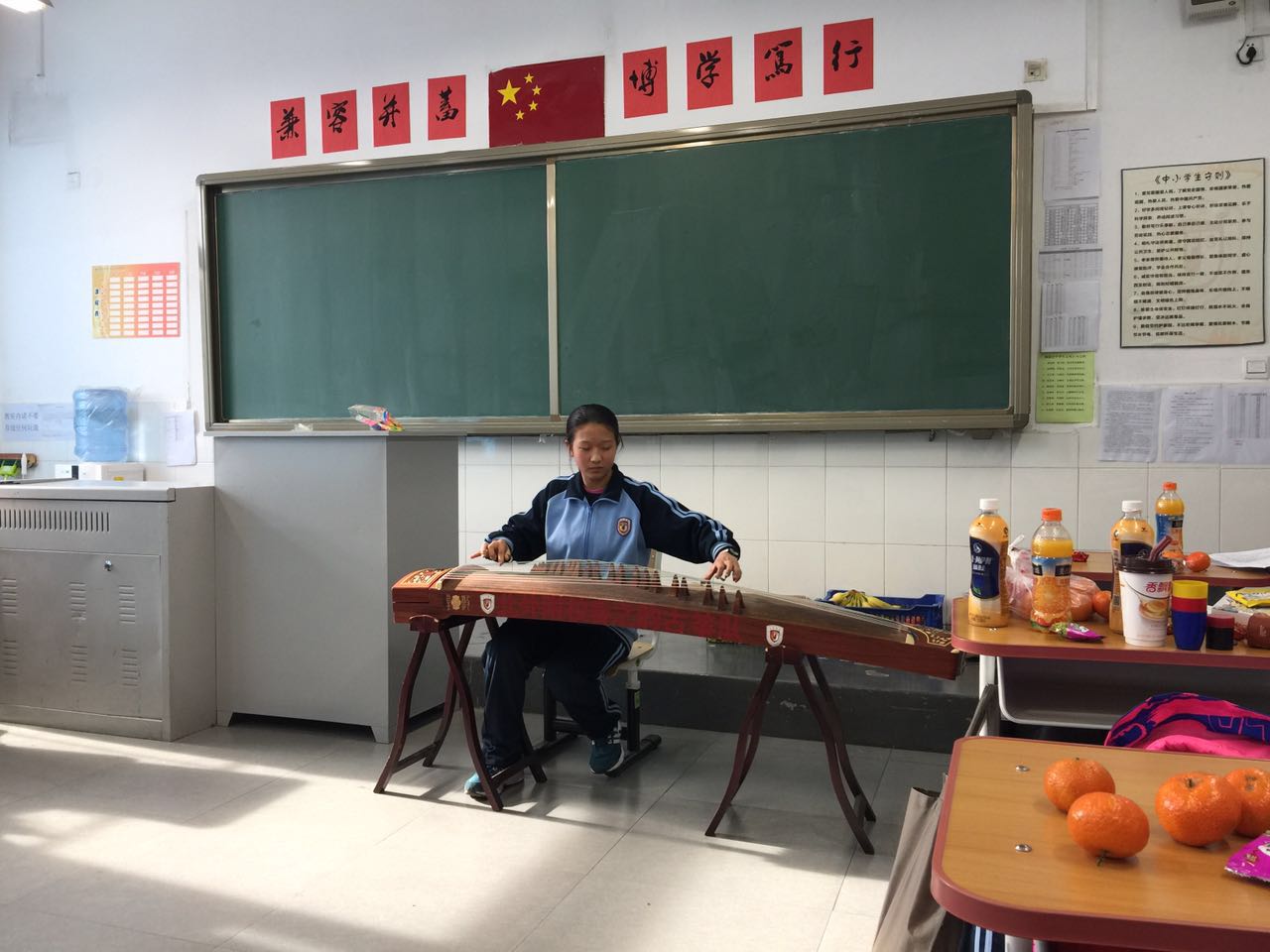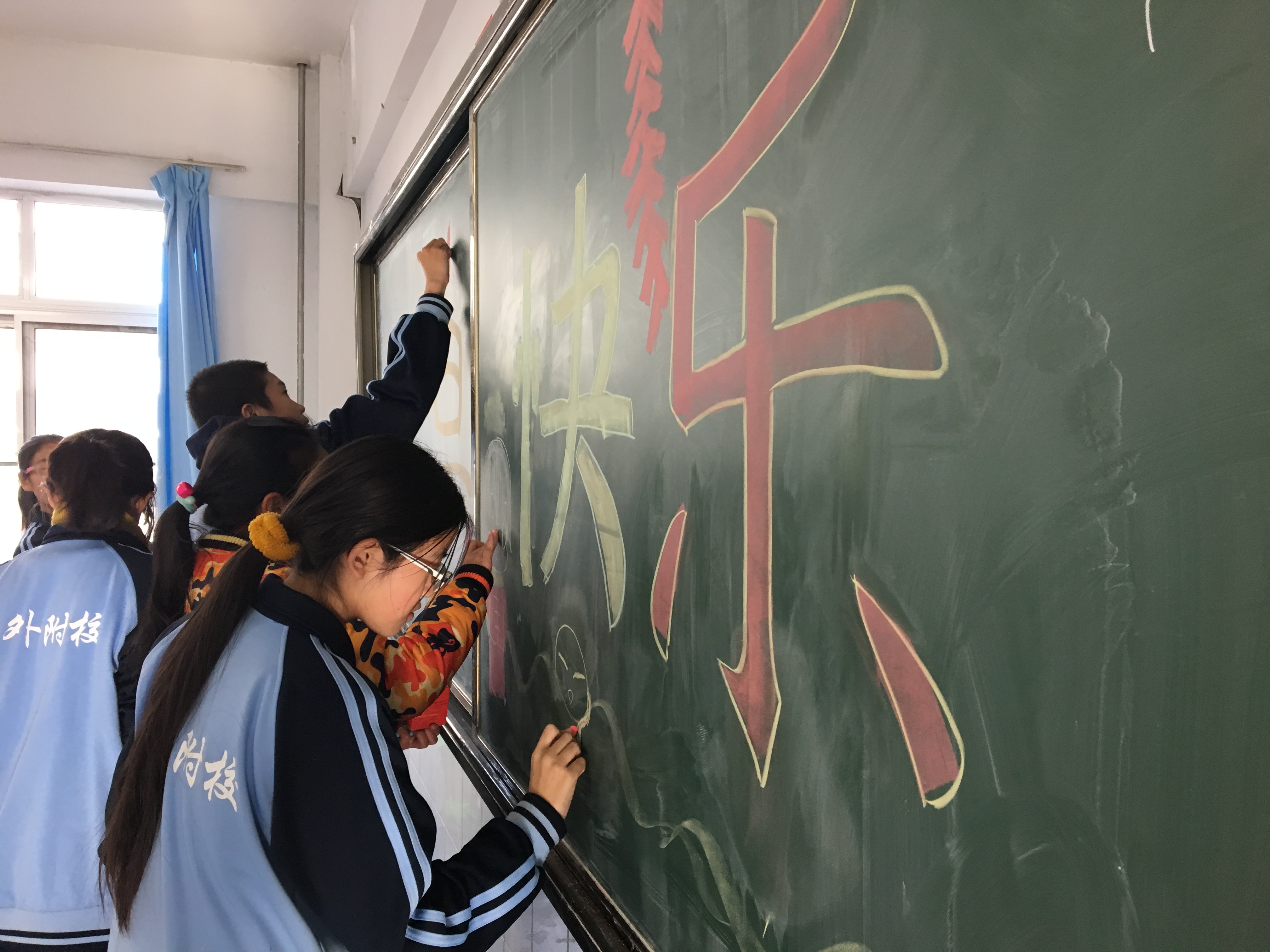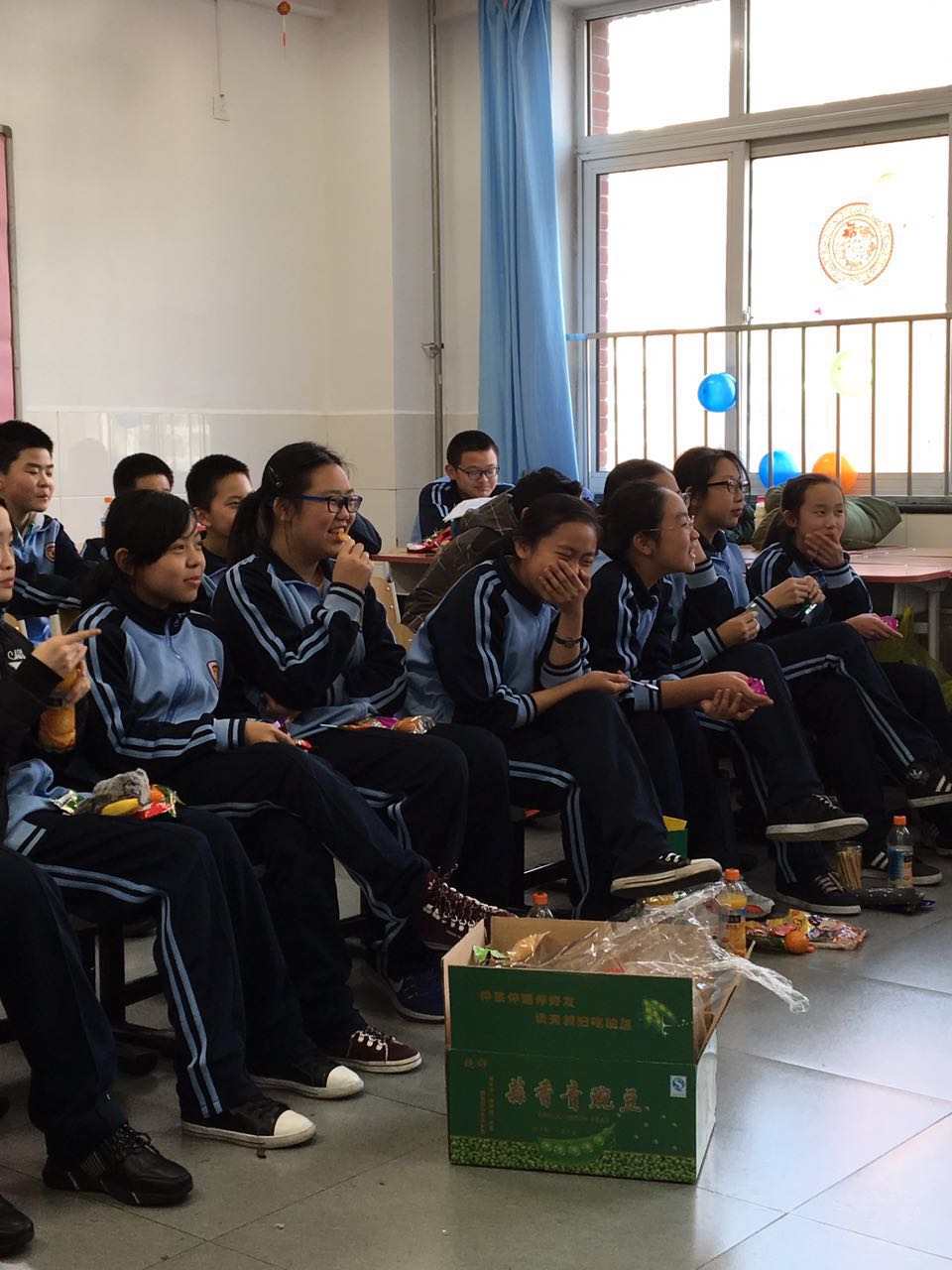 各班班主任和学生共同打扫布置教室,学生们积极的摆桌子,热闹的吹气球,在黑板上写下“元旦快乐”。各班的节目也是种类繁多,精彩纷呈。既有古筝、竹笛等悠扬婉转的古典乐器表演,也有手风琴、小提琴等西洋乐器的演奏;既有让人捧腹大笑的相声、小品、评书,也有悦耳动听的歌曲演唱;既有姿态优美的古典舞蹈,也有动感十足的街舞表演。节目中间还穿插了你比我猜、萝卜蹲等欢乐的游戏。主持人的风趣幽默的串场将联欢会推向了一个又一个的高潮。