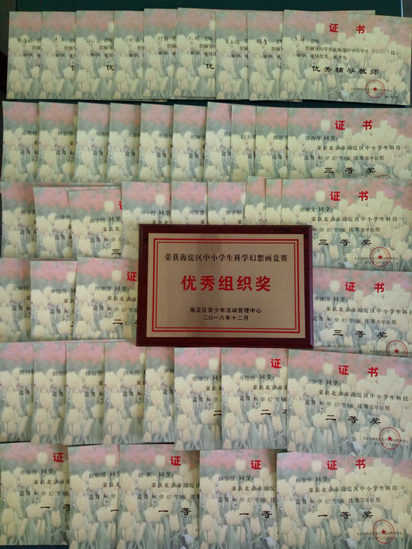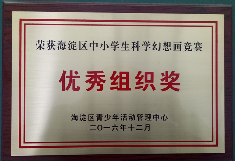 2016年11月,我校小学美术组组织学生参加“北京市海淀区中小学生科技幻想画”比赛,本次比赛目的在于培养学生的科学想象力、创新意识,经过老师和同学们的精心准备,我校共有123名学生参加,40余名学生获奖,黄海锟等9名教师荣获优秀辅导教师奖,我校在本次比赛中荣获“优秀组织奖”。